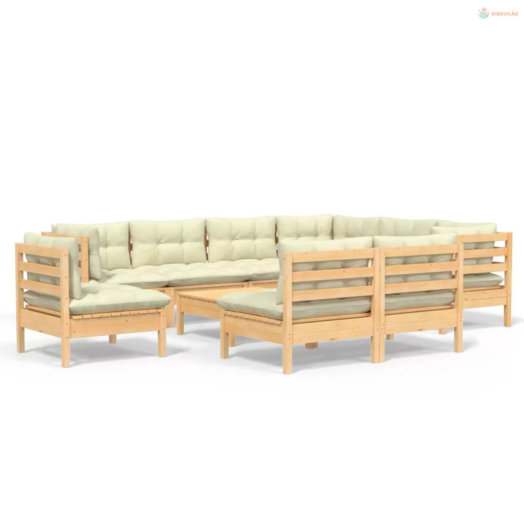10 részes fenyőfa kerti bútorgarnitúra krémszínű párnákkal