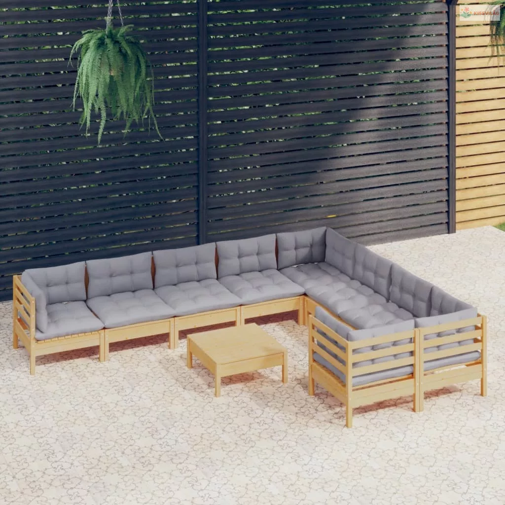 10 részes fenyőfa kerti ülőgarnitúra szürke párnákkal