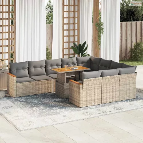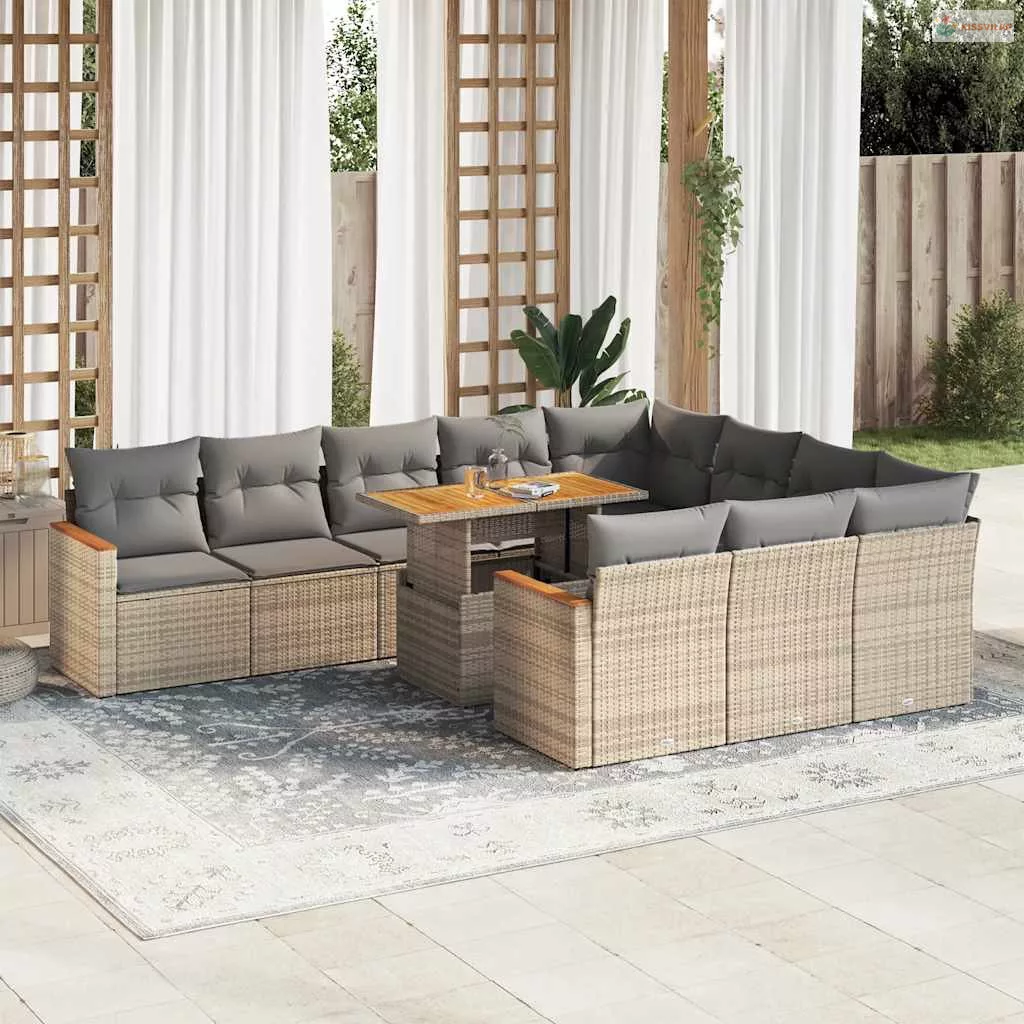 11 részes bézs polyrattan akácfa kerti ülőgarnitúra párnákkal