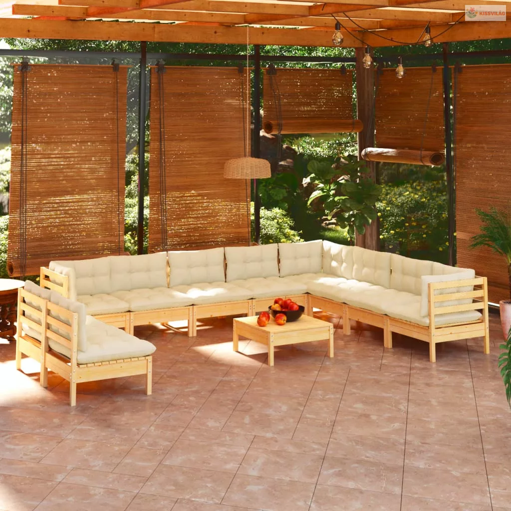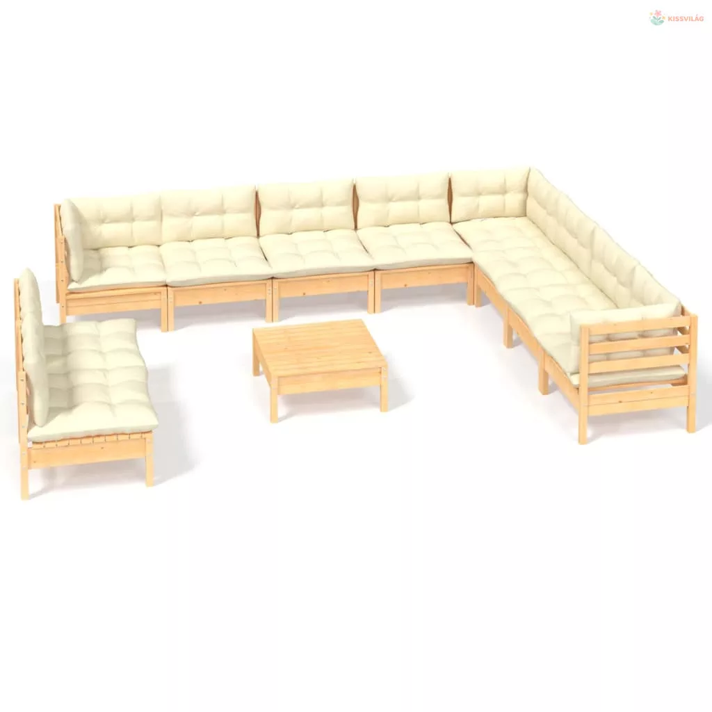 11 részes tömör fenyőfa kerti ülőgarnitúra krémszínű párnákkal
