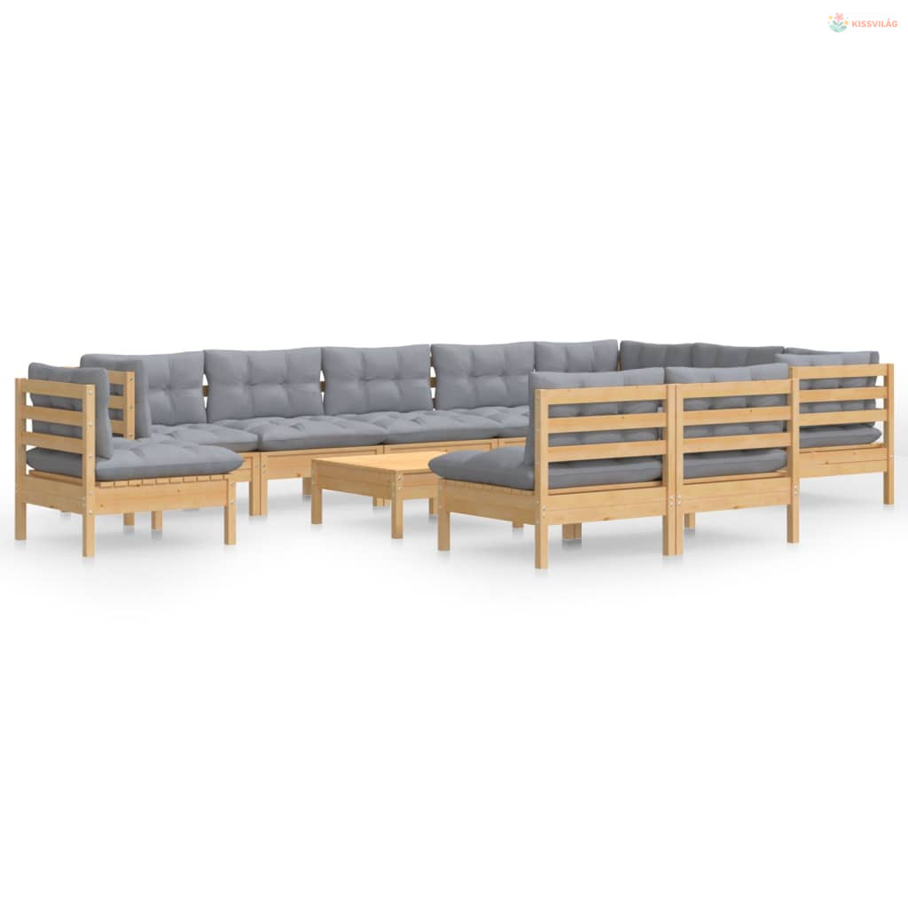 11 részes tömör fenyőfa kerti ülőgarnitúra szürke párnákkal