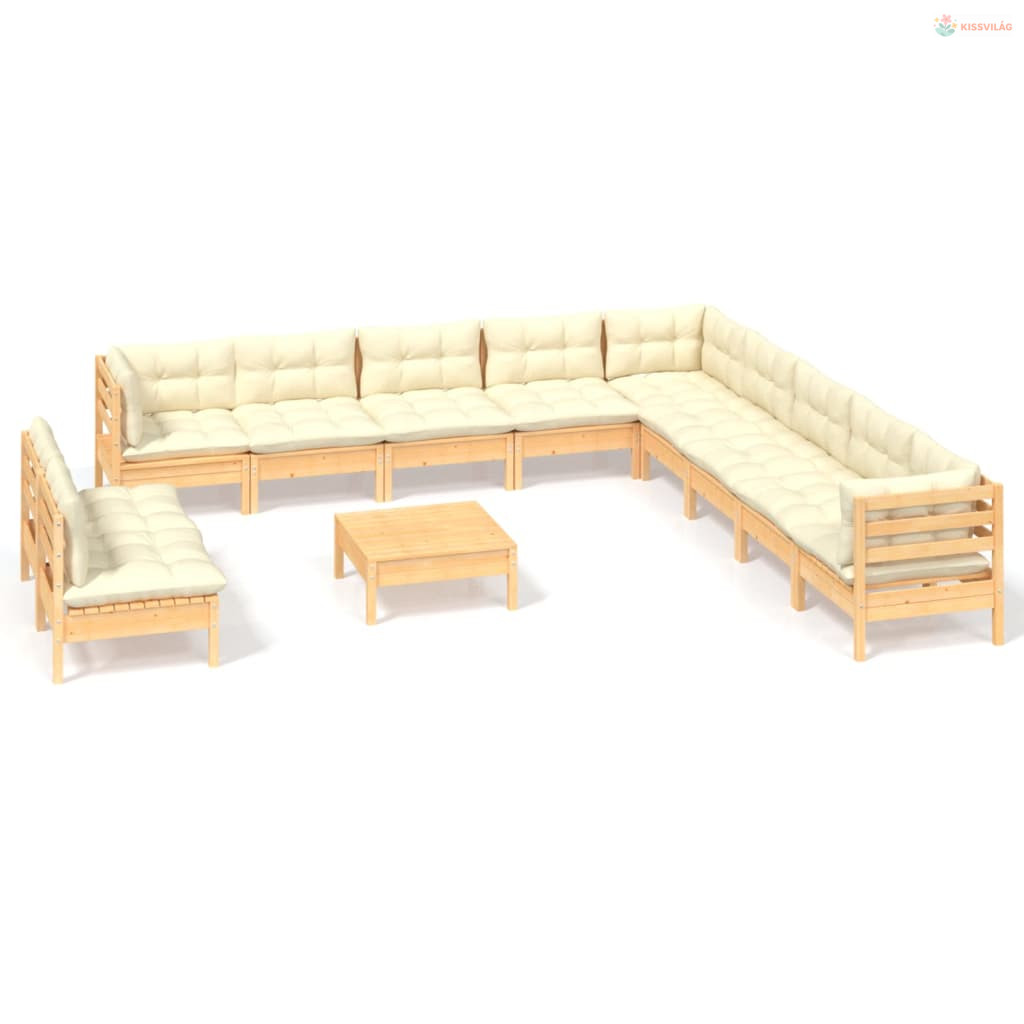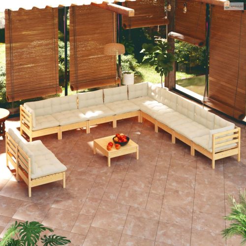 12 részes tömör fenyőfa kerti ülőgarnitúra krémszínű párnákkal
