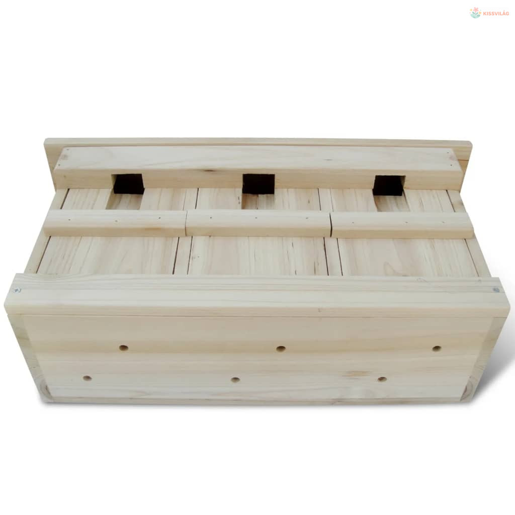 A ház természetes fa színű és tökéletes dísz, valamint ugyanakkor meleg és biztonságos madárfészek is lesz. Ez a madár ház 3 kamrával rendelkezik, ami 3 tenyészpárnak alkalmasak csibéik felnevelésére. Mindegyik kamrán levehető elülső ajtó található a könnyű tisztítás érdekébe. A fém akasztókkal felszerelt madárház készen áll a kertben való felszerelésre.