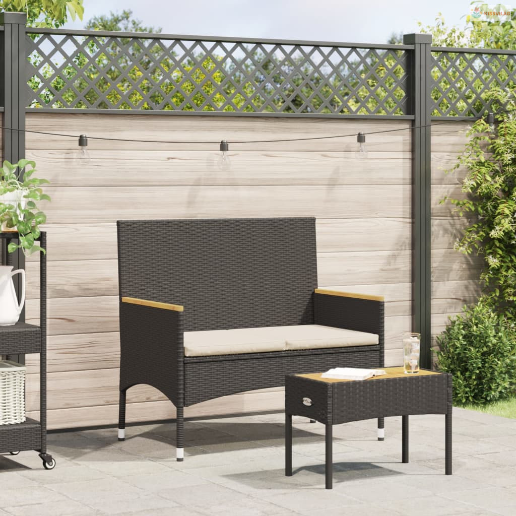 2 személyes fekete polyrattan kerti pad párnával és asztallal