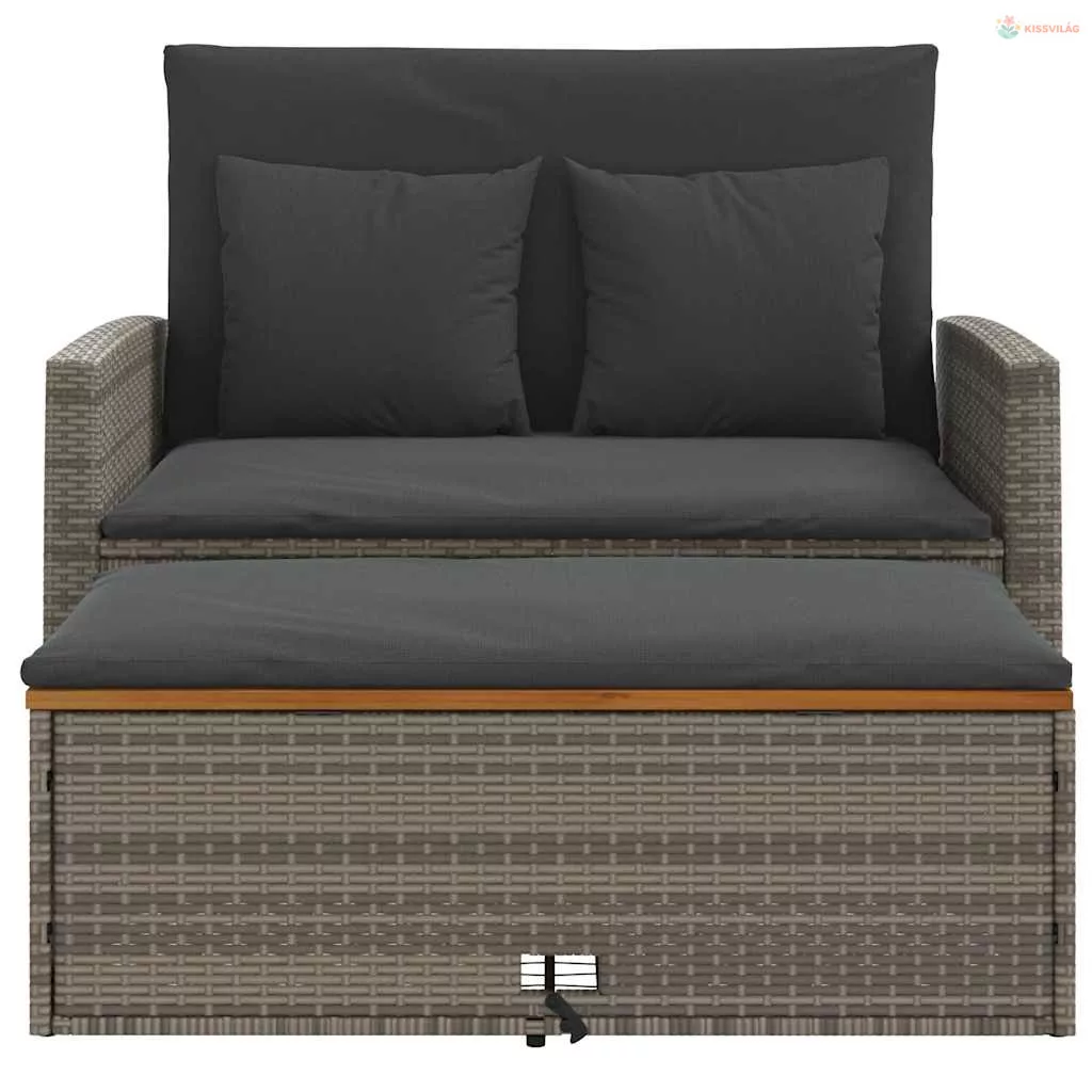2 személyes szürke polyrattan/akácfa kerti kanapé párnával