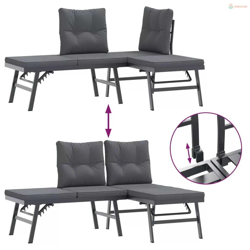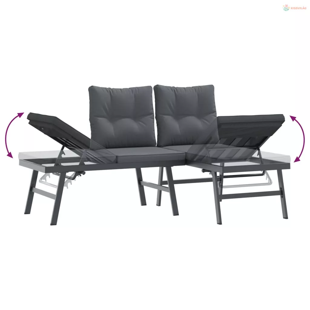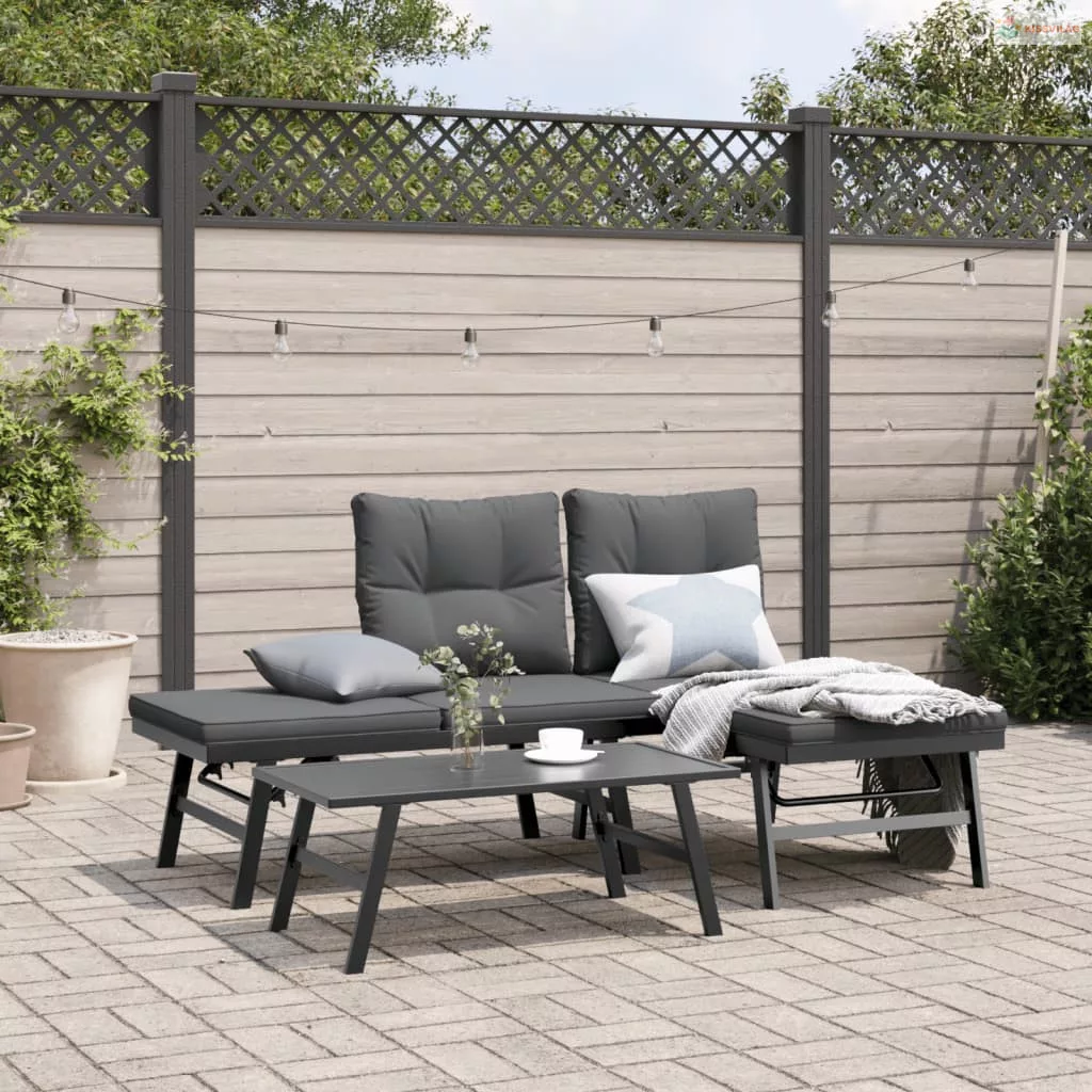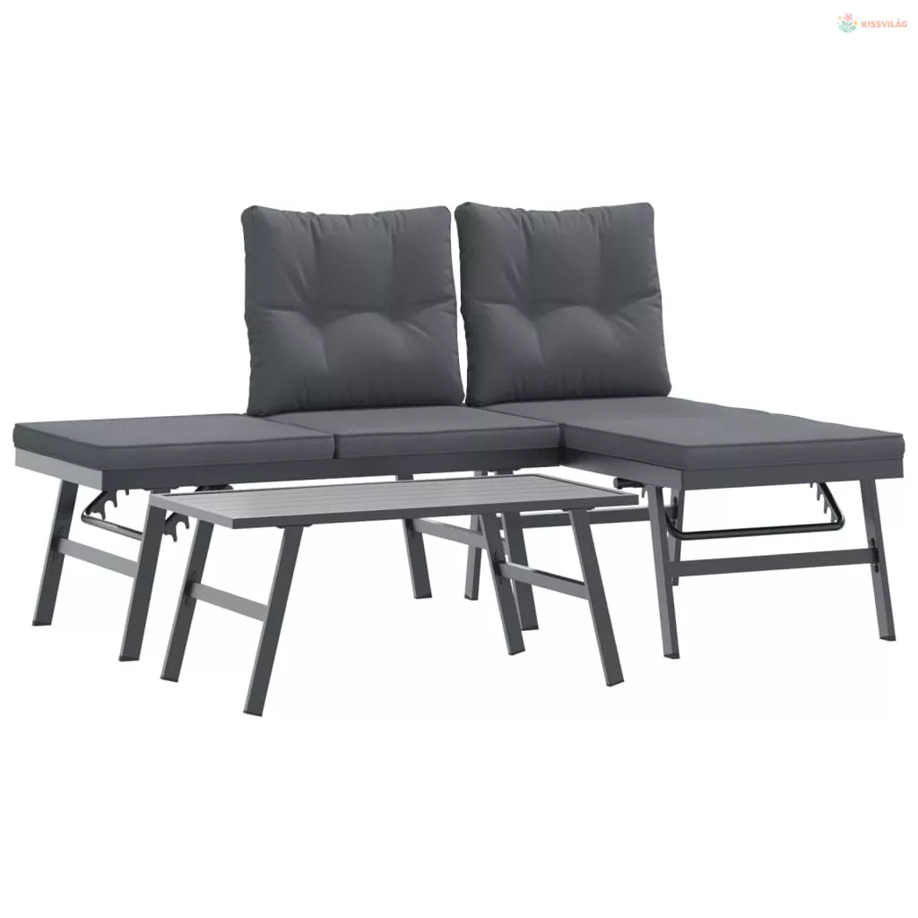 3 részes fekete porszórt acél kerti pad szett párnával