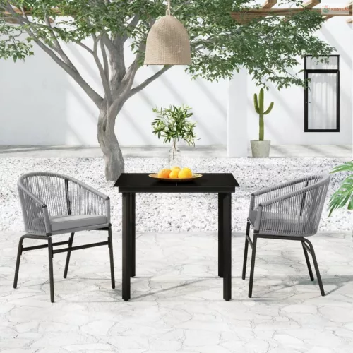 Ez a kerti étkészlet porszórt acélvázzal rendelekzik, így masszív és stabil, tehát tökéletes a mindennapi kültéri használatra. A sima üveglap nedves ruhával könnyen tisztítható, továbbá ideális ételek, italok és egyéb dísztárgyak elhelyezésére. A teraszszékek PVC rattanból készültek, így tartósak és ellenállnak a rossz időjárásnak és az UV-sugaraknak. Emellett minden székhez egy levehető, vastag párna tartozik, amely még kényelmesebbé teszi a pihenést.