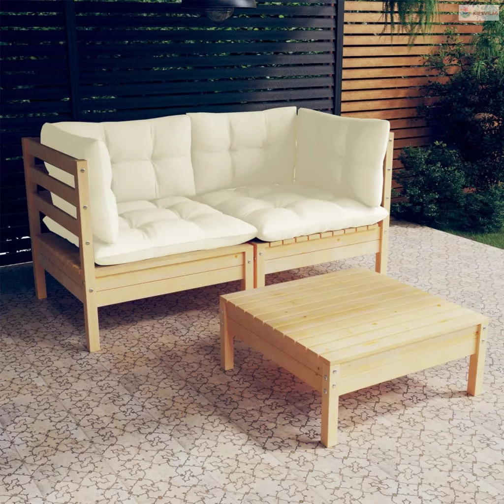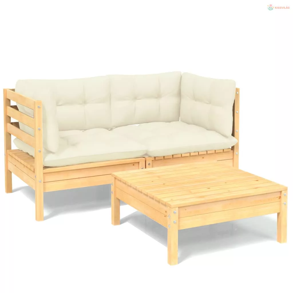 3 részes tömör fenyőfa kerti ülőgarnitúra krémszínű párnákkal
