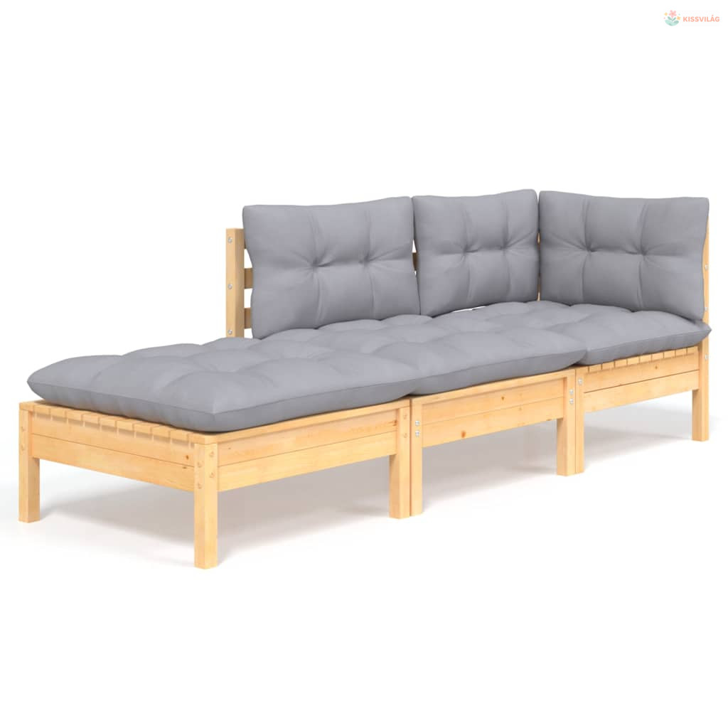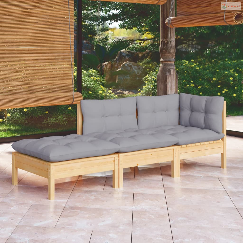 3 részes tömör fenyőfa kerti ülőgarnitúra szürke párnákkal