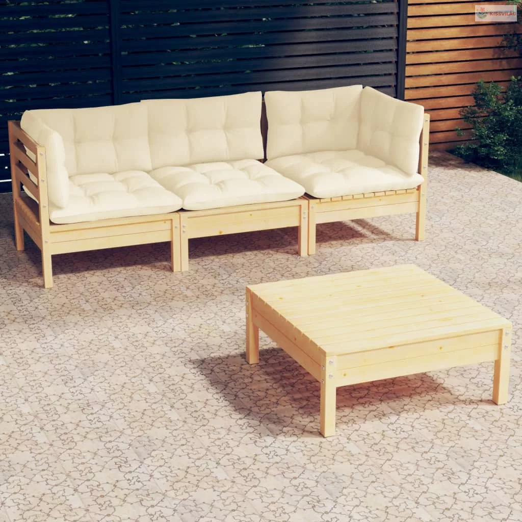 4 részes fenyőfa kerti ülőgarnitúra krémszínű párnákkal