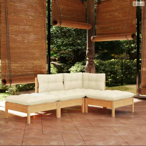 4 részes tömör fenyőfa kerti ülőgarnitúra krémszínű párnákkal