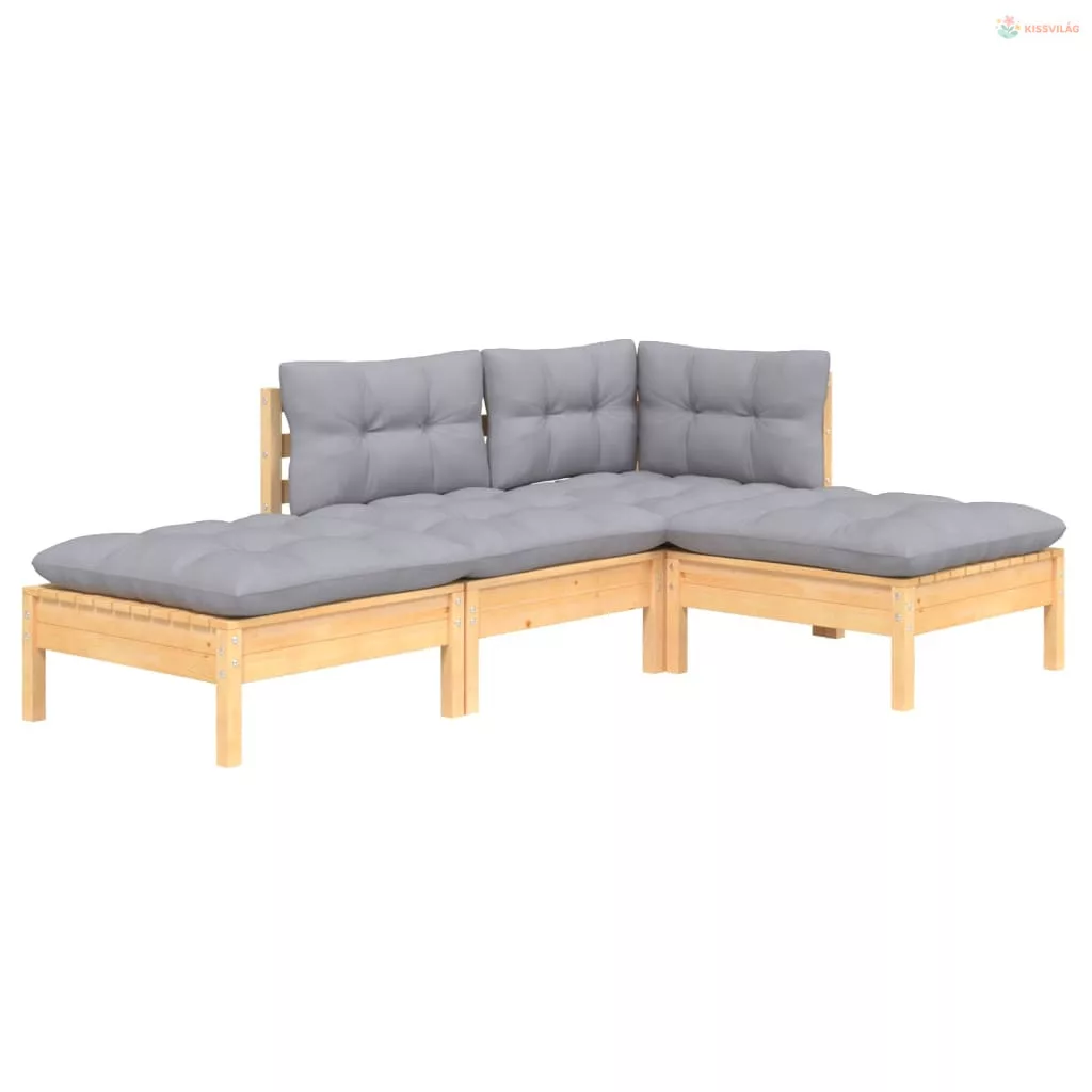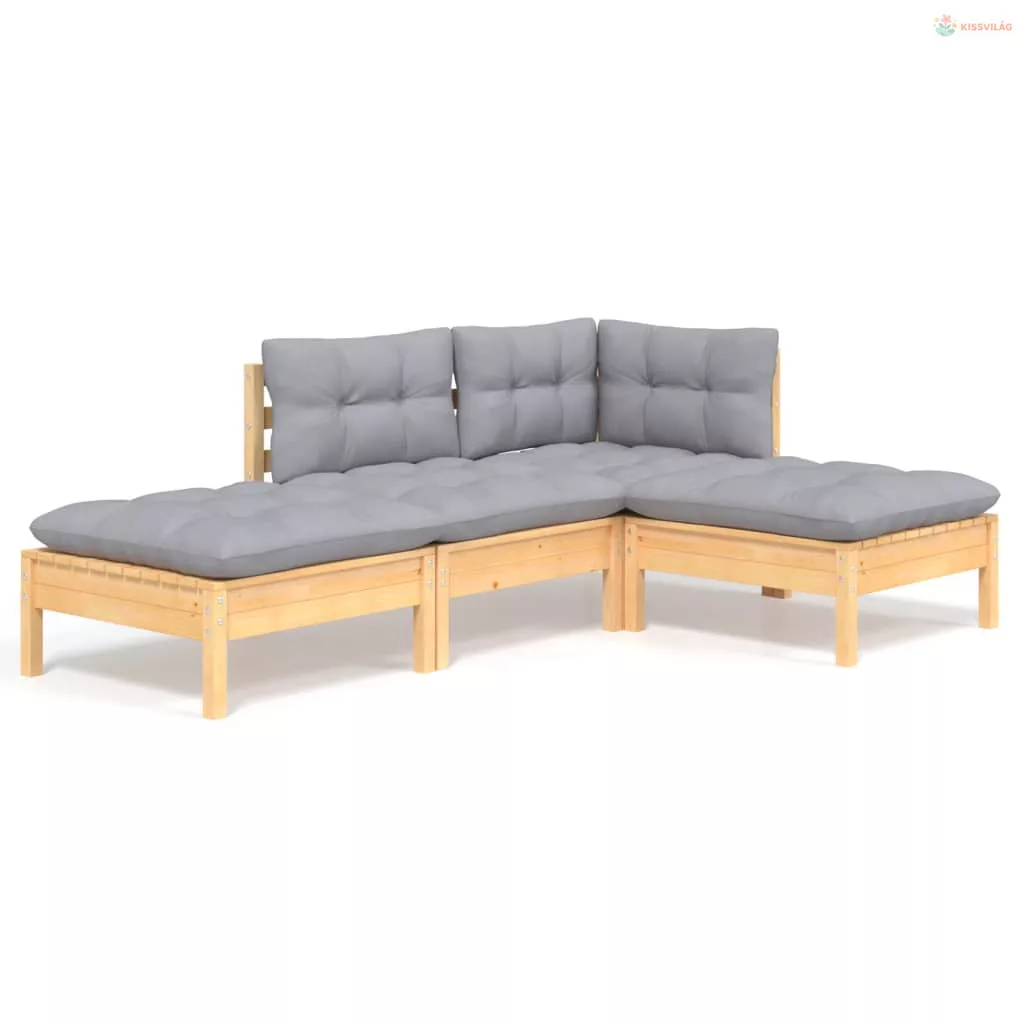 4 részes tömör fenyőfa kerti ülőgarnitúra szürke párnákkal