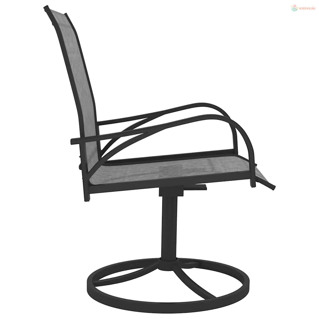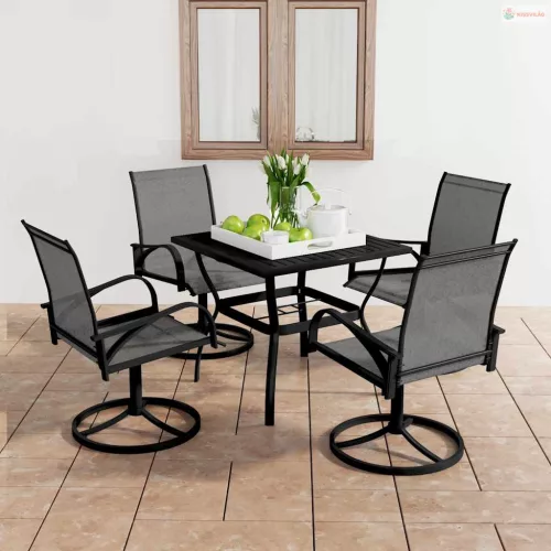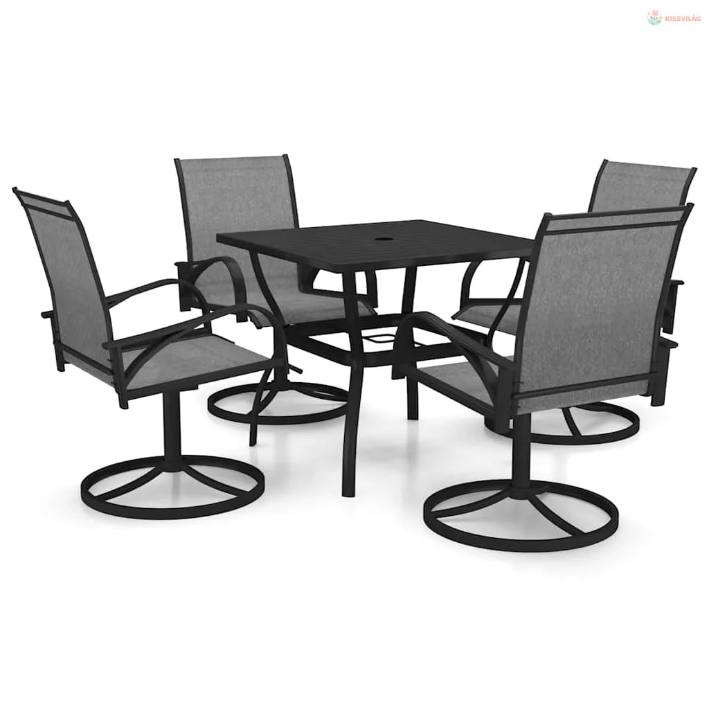 A kültéri asztal és a székek porszórt acélból készültek, így erősek és stabilak. A légáteresztő textilén ülő- és hátpárnák jól szellőznek és gyorsan is száradnak. A 360 fokban elforgatható, kerek alapzat, az ergonomikus háttámla és az ívelt kartámaszok fokozzák a kényelmet pihenés közben.