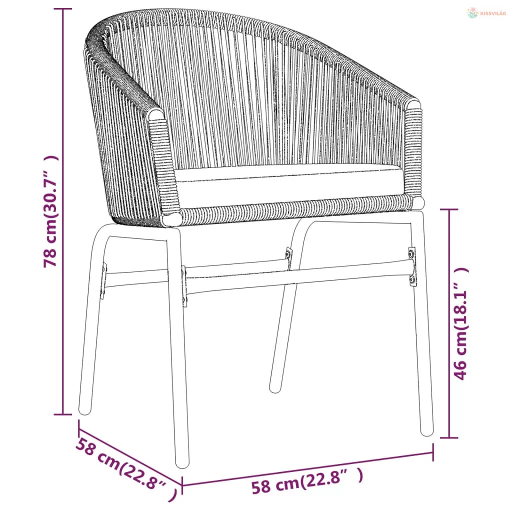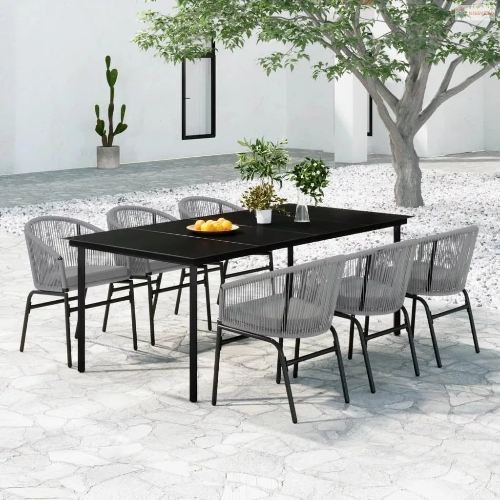 Ez a kerti étkészlet porszórt acélvázzal rendelekzik, így masszív és stabil, tehát tökéletes a mindennapi kültéri használatra. A sima üveglap nedves ruhával könnyen tisztítható, továbbá ideális ételek, italok és egyéb dísztárgyak elhelyezésére. A teraszszékek PVC rattanból készültek, így tartósak és ellenállnak a rossz időjárásnak és az UV-sugaraknak. Emellett minden székhez egy levehető, vastag párna tartozik, amely még kényelmesebbé teszi a pihenést.
