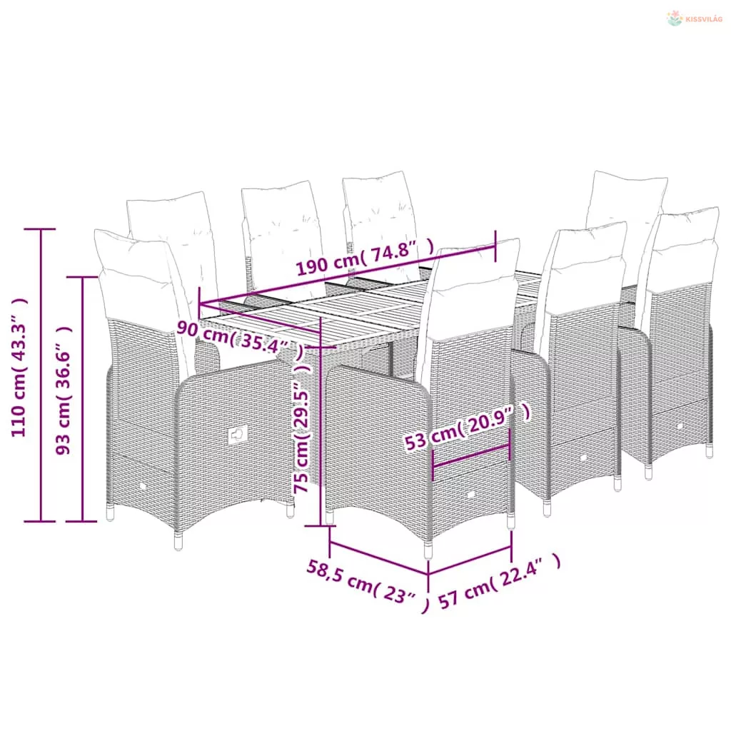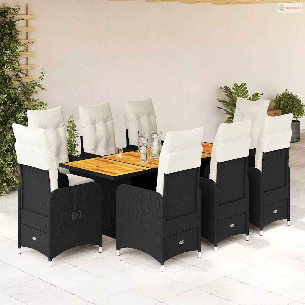 9 részes fekete polyrattan kerti bisztrógarnitúra párnákkal