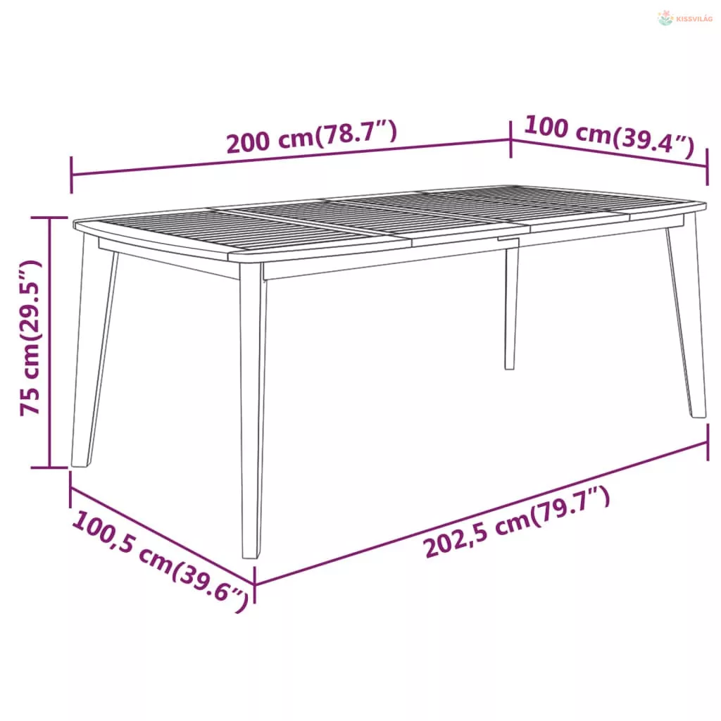 • Asztal teljes mérete: 202,5 x 100,5 x 75 cm (Ho x Szé x Ma)
