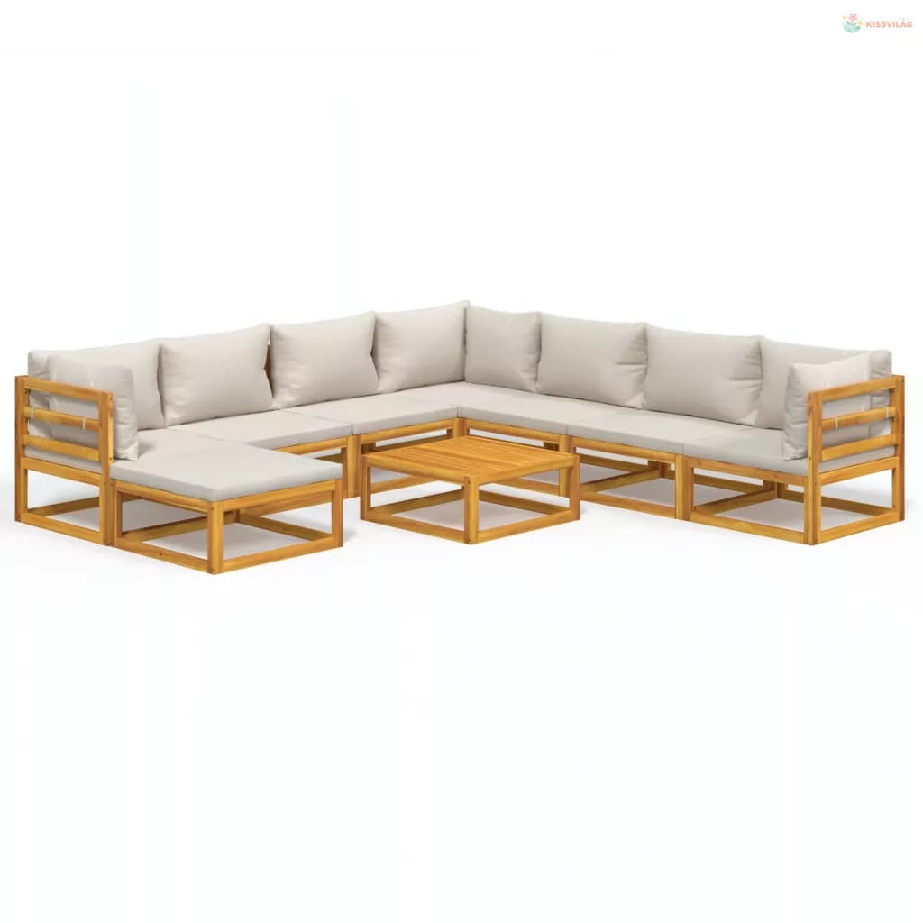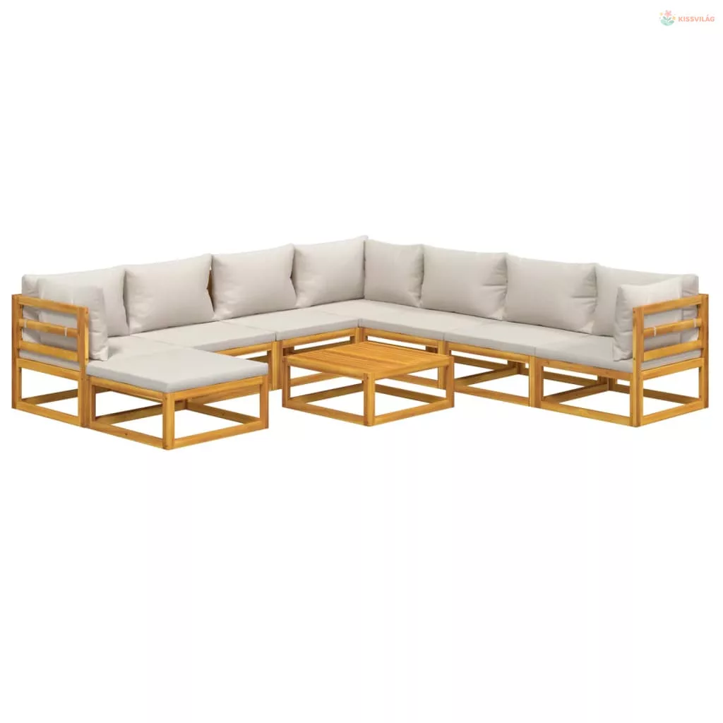 9 részes tömör fa kerti ülőgarnitúra világosszürke párnákkal