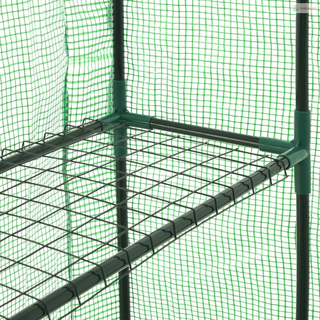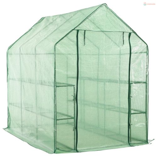 Ez a porszórt acélvázzal rendelkező minőségi melegház nagyon stabil és tartós. Az egy darabból álló, szőtt nylon tető ellenáll az UV-sugaraknak, a ház ajtaja pedig a fokozott szellőzés és a könnyű be- és kijárás érdekében cipzáras. Az átlátszó zöld tető lehetővé teszi, hogy a napfény elérje növényeit és virágait, így a növények maximálisan felhasználhatják a nap energiáját, és melegebb lesz a hőmérséklet. A ház 12 erős polca sok helyet biztosít tálcáknak, edényeknek vagy ültetvényeknek.
