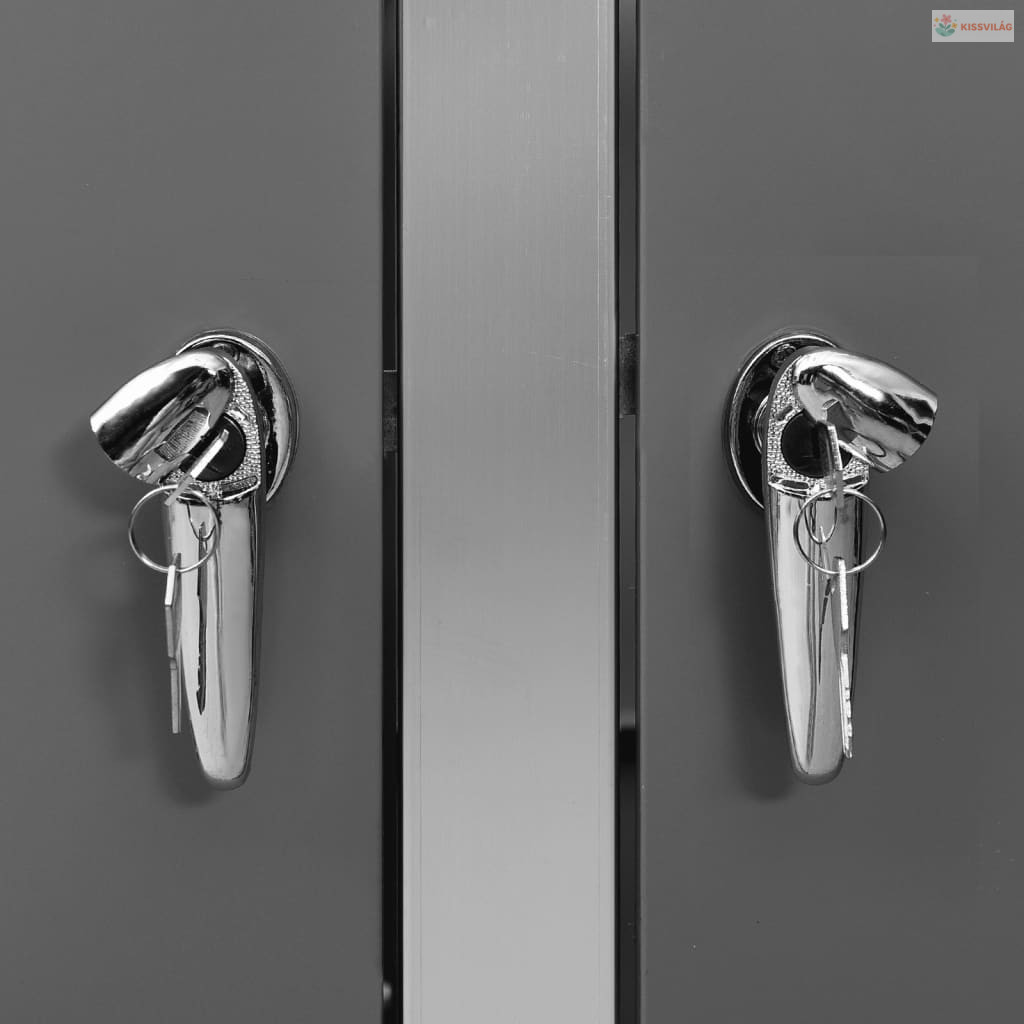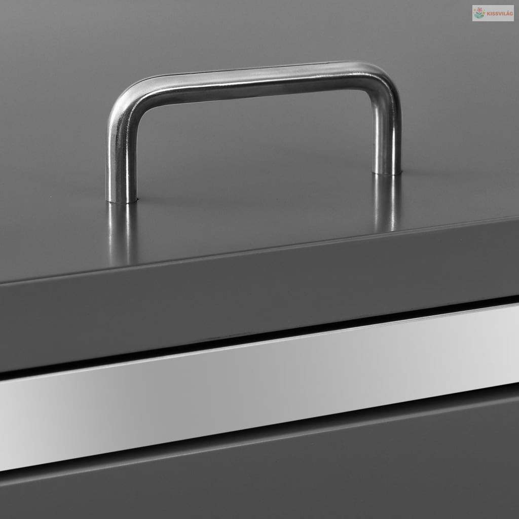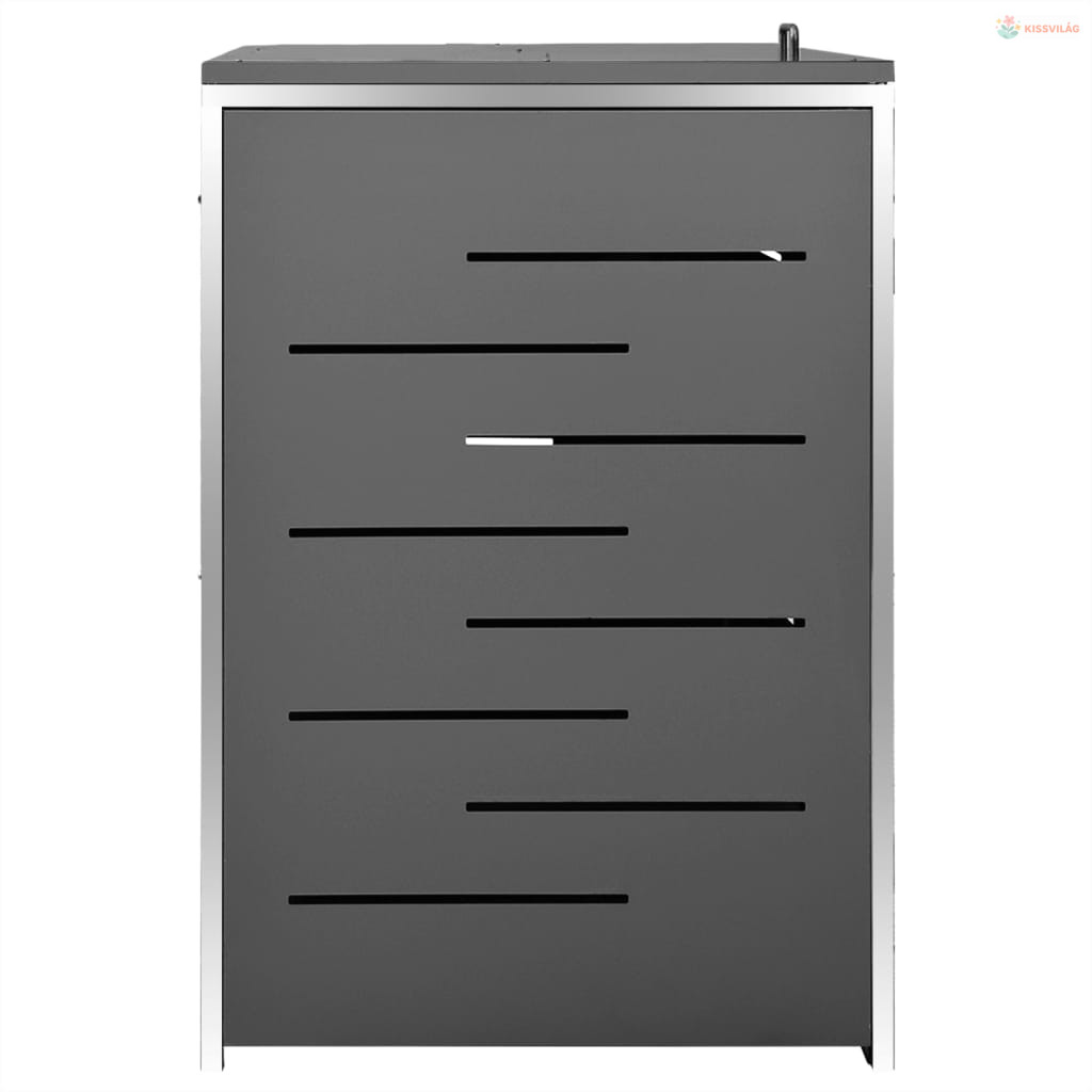 Ez a szemeteskuka tároló horganyzott acélpanelből és acélvázból készült, így rendkívül stabil és rozsdaálló. Az üreges tervezés lehetővé teszi a légáramlást és meggátolja a kellemetlen szagokat, a zárrendszer pedig biztosítja a szemeteskukák biztonságos tárolását. Továbbá a praktikus rugós fedél egyszerűvé teszi a kukát be- és kitolását.