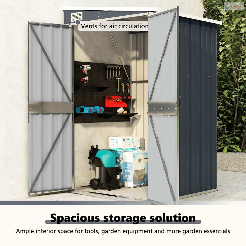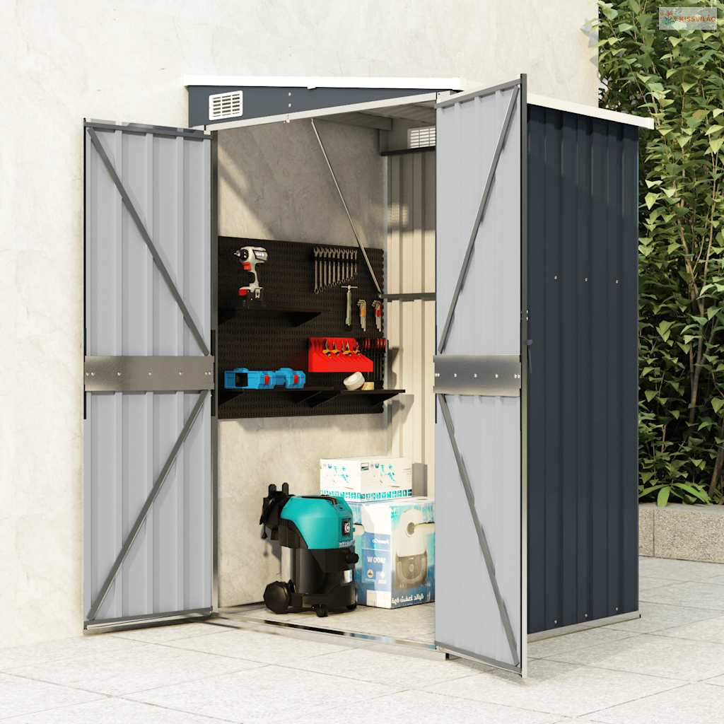 Mivel horganyzott acélból és fémből készült, a tároló minimális karbantartást igényel és nagyon tartós. Az elülső dupla nyíló ajtók könnyű be- és kijutást tesznek lehetővé. A zárható műanyag fogantyú biztosítja a tárgy biztonságát. Ezenkívül az esővíz automatikusan elfolyik a tetőről a lejtős kialakításnak köszönhetően.