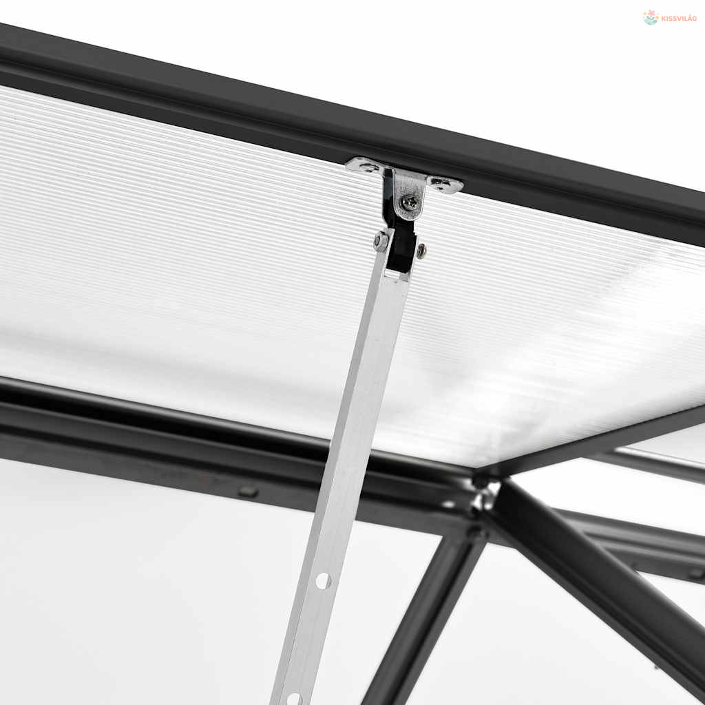 Ez a polikarbonát panelekből készült, tömör melegház UV-álló és hőszigetelt. Az üvegház masszív és karbantartást nem igénylő alumínium szerkezettel rendelkezik, alapkerettel (4 erős profilból áll) az extra stabilitás érdekében. A csatornarendszer hatékonyan vezeti el a vizet, a tetőszellőző pedig optimális szellőzést biztosít a forró napokon. A tetőpanelek fémkapcsokkal vannak rögzítve, tartósságot és hosszú távú használatot biztosítva. Melegházunk könnyen összeszerelhető.