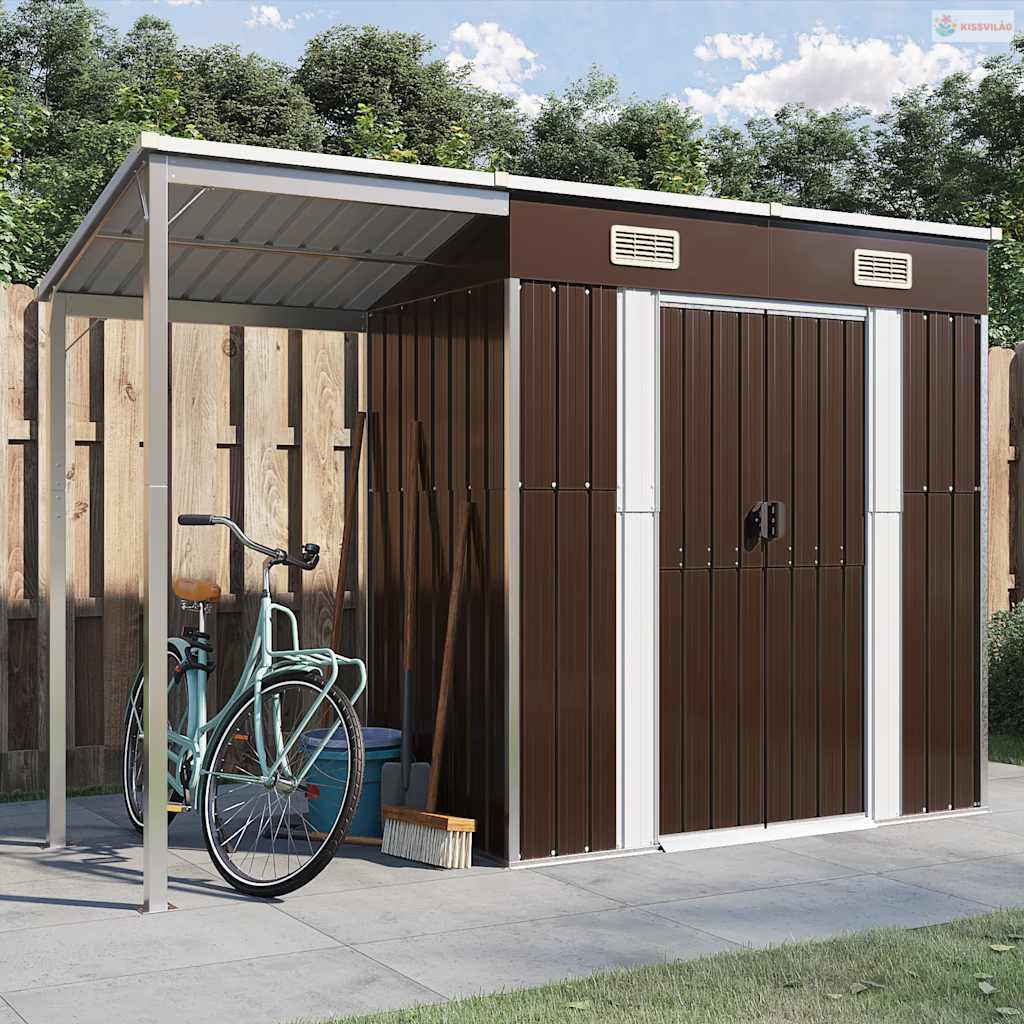 Barna kerti fészer meghosszabbított tetővel 277x107x181 cm