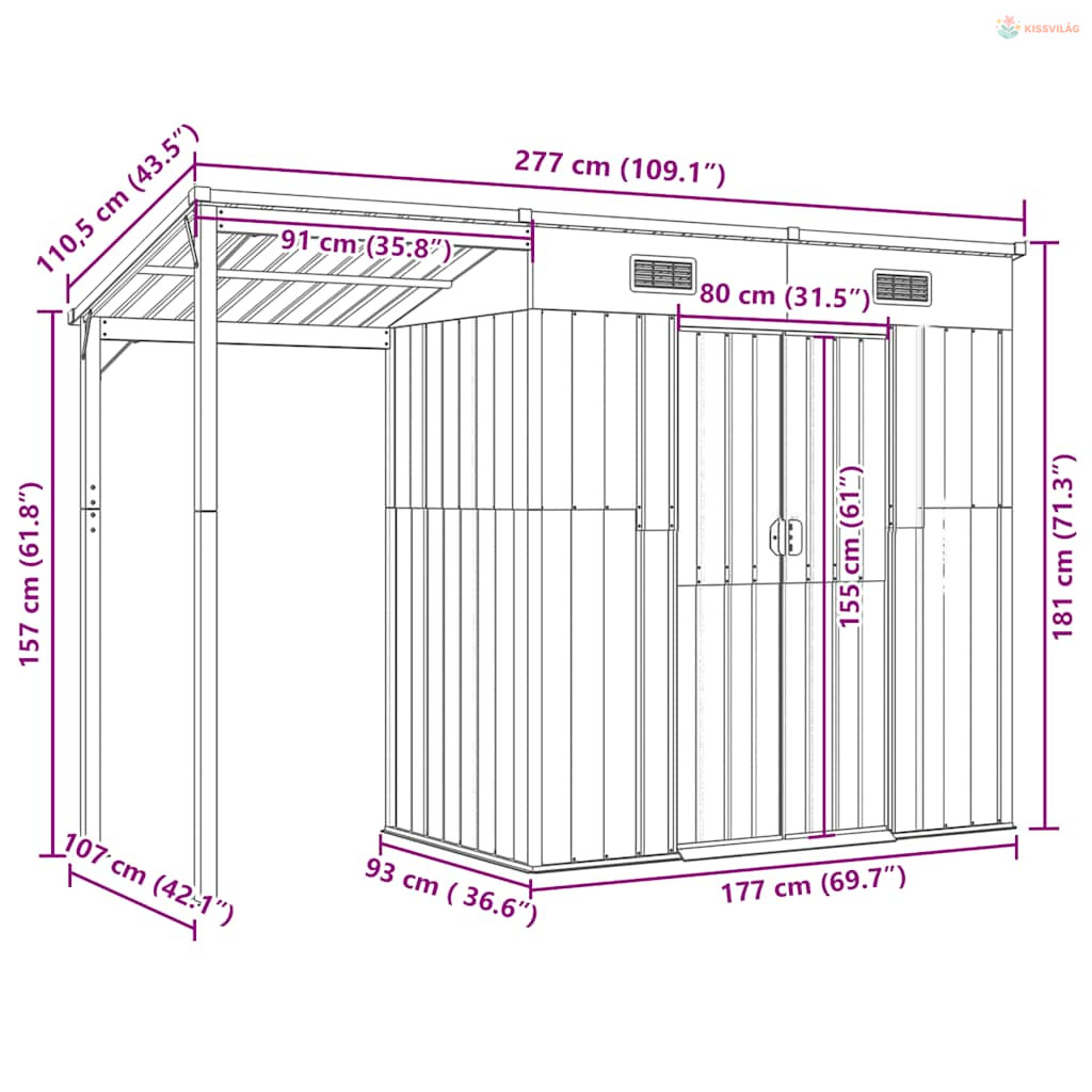 • Fészer külső mérete: 177 x 93 x 157/181 cm (Szé x Mé x Ma)