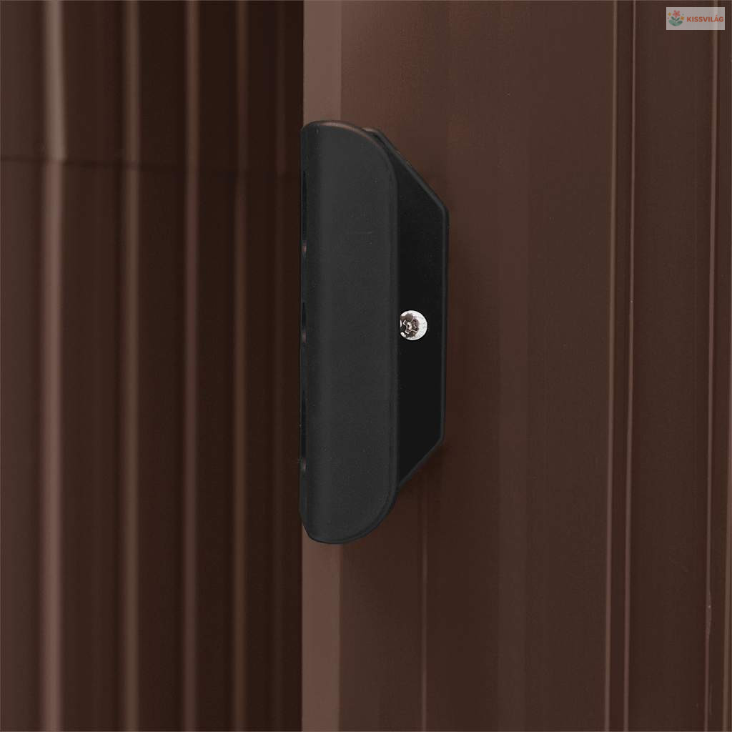 • Praktikus kialakítás: A kerti fészer elöl és hátul is szellőzőnyílásokkal rendelkezik, amelyek kiváló szellőzést biztosítanak. Az egyetlen tolóajtó műanyag ajtókilinccsel elöl lehetővé teszi a könnyű be- és kijutást.