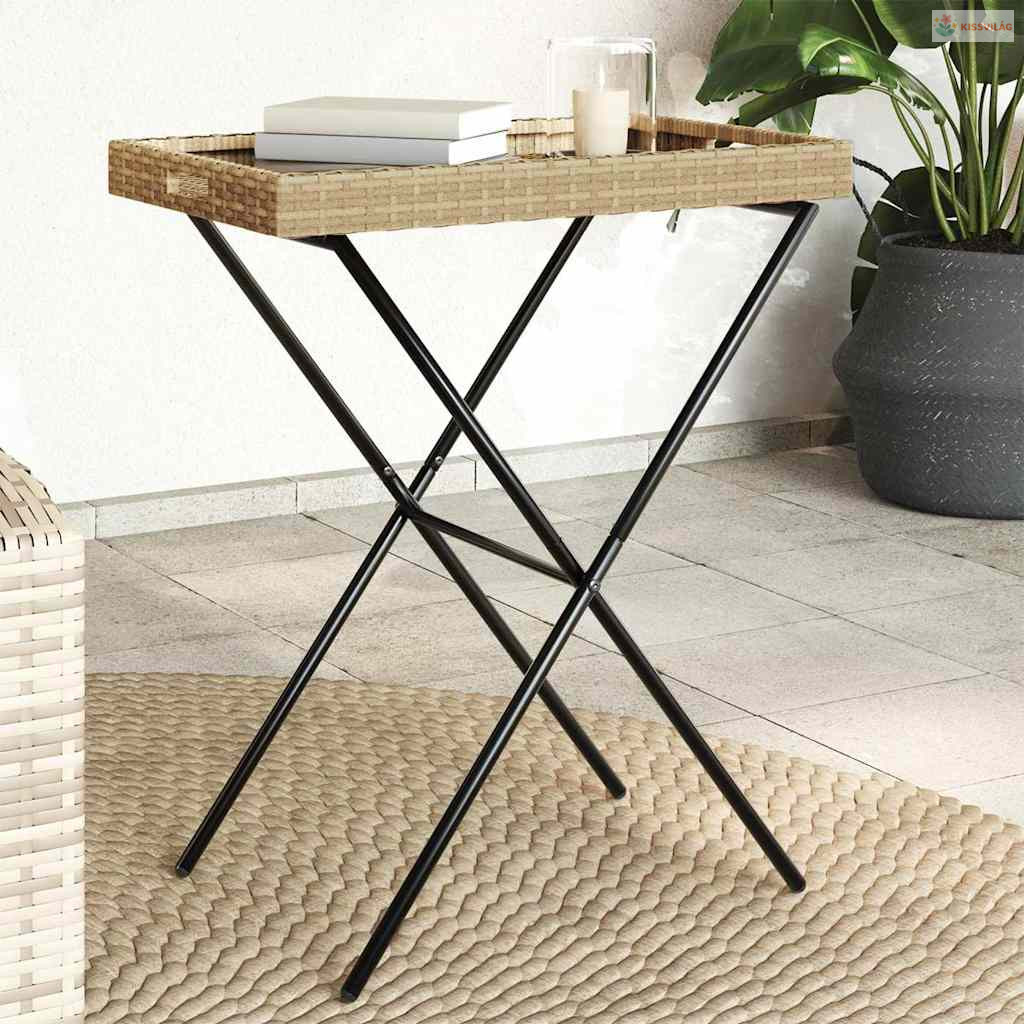 Ez a polyrattan összecsukható tálcás asztal klasszikus, egyszerű és letisztult vonalakkal rendelkezik, és nagyszerű választás a kertbe, a teraszra vagy más kültéri környezetbe.