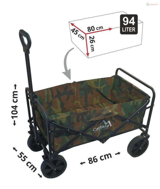 Kempingezni vagy sátor alá menni a természetbe. Többé nem kell a dolgait a kezedben vagy hátizsákban a hátadon cipelned. Helyezze őket a praktikus Cattara TROGIR ARMY összecsukható kocsiba. Rengeteg tárgy, alapanyag és poggyász elfér benne, és akár 50 kg-ot is elbír.