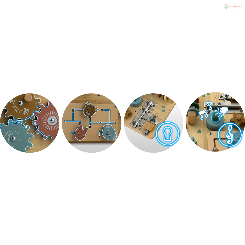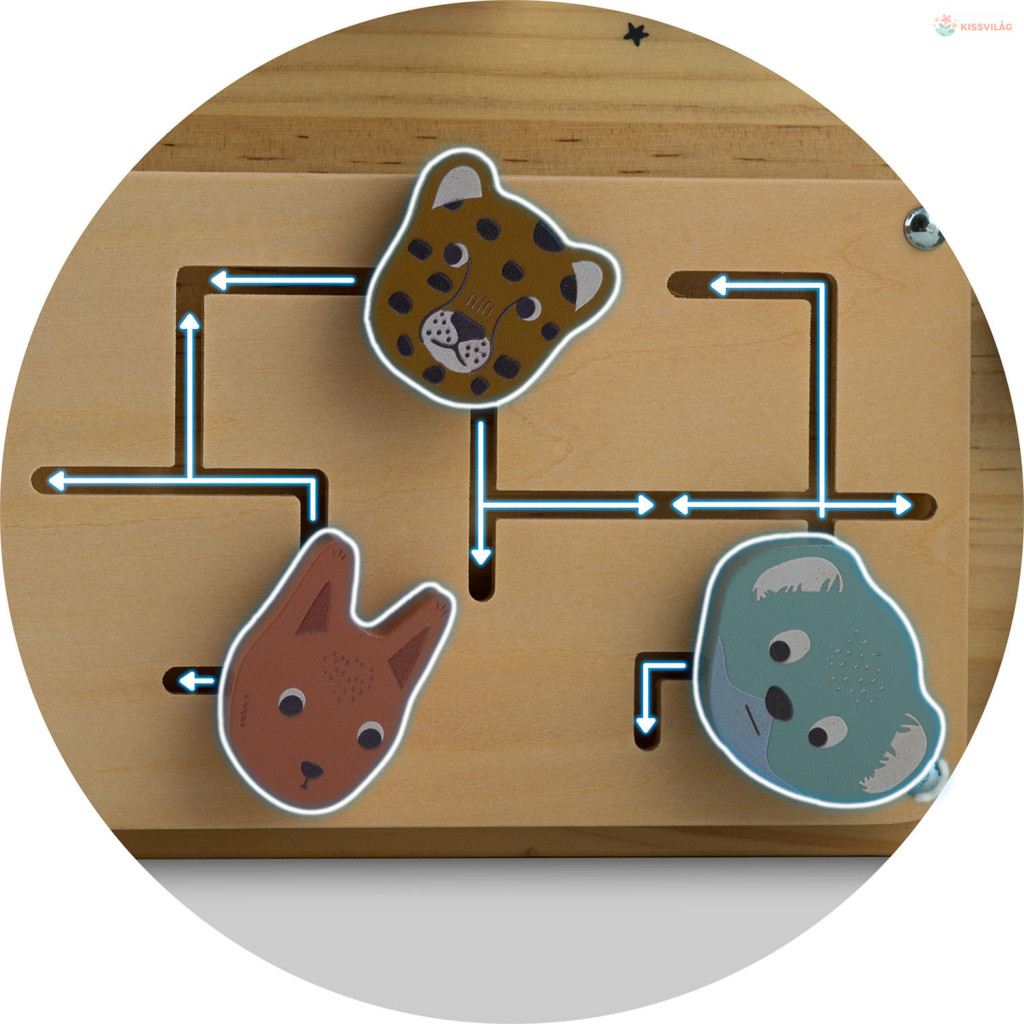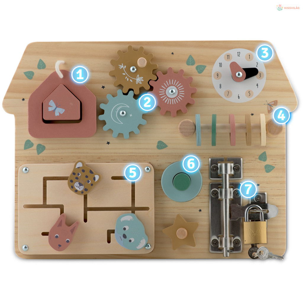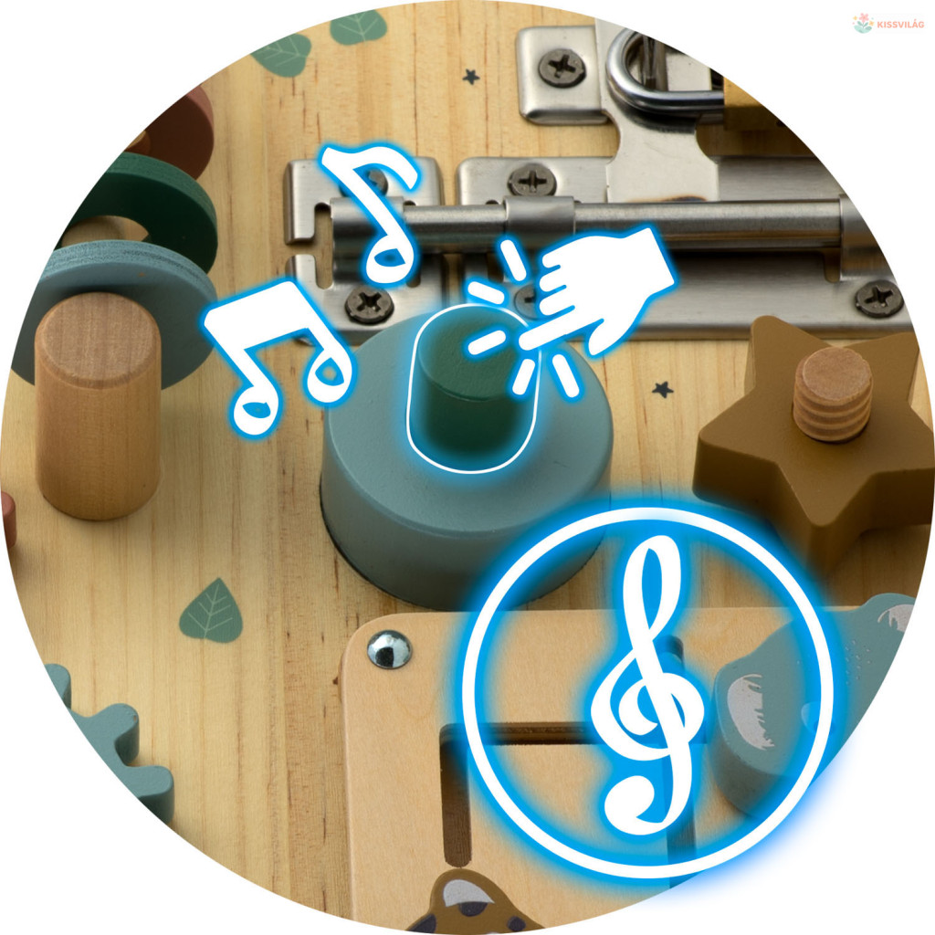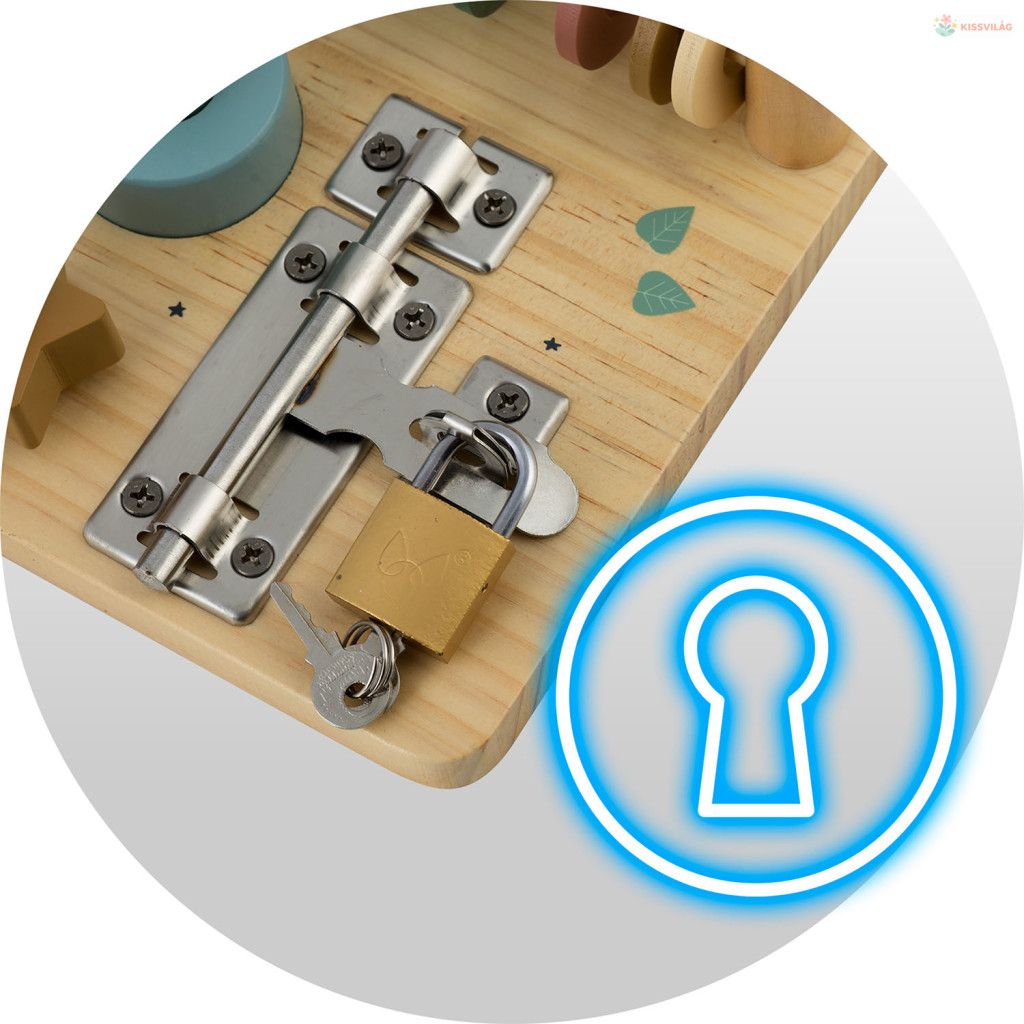 Fedezd fel a Nukido NK-859 fa szenzoros táblát, amely egyetlen kompakt házikó formába sűríti a felfedezés örömét! A masszív, natúr fa alapot pasztellszínű fogaskerekek, óra, abakuszgyöngyök, labirintus, lakat és hanggomb tarkítja, így a kicsik játék közben fejlesztik finommotorikájukat, szín- és formafelismerésüket. A változatos textúrák és mozgó elemek izgalmas tapintási, vizuális és auditív ingert nyújtanak, miközben az EN71 tanúsítvány gondoskodik a biztonságról. Miért jó a Drewniana tablica sensoryczna NK-859 Nukido? Hordozható, egyrészes kialakítása miatt utazáskor is leköti a gyermeket, nincs elveszhető darab. A Montessori ihlette feladatok önálló felfedezésre sarkallnak, növelve a koncentrációt és az önbizalmat. A természetes fa tartós, a lekerekített élek biztonságosak, a pasztell árnyalatok pedig nyugodt, barátságos környezetet teremtenek a tanuláshoz. Ezért fogod szeretni: • 9 különböző modul egy táblán – fogaskerék, labirintus, óraszerkezet és még sok más • Valódi lakat kulccsal – izgalmas sikerélmény a nyitás-zárás • Natúr fa + bababarát festék – hosszú életű, fenntartható választás • Utazóbarát: mindössze 1,22 kg, könnyen csomagolható • Színes díszdobozban érkezik – tökéletes ajándékötlet Használati útmutató: • Helyezd a táblát stabil felületre vagy az ölébe • Pörgesd meg a fogaskerekeket, majd hagyd a gyermeket kísérletezni • Nyisd ki a lakatot a kulccsal, zárd vissza, gyakorolva a csuklómozgást • Vezesd végig az állatfigurákat a labirintuson a célig • Játék után töröld le puha, száraz kendővel, és tedd vissza a dobozába A csomag tartalma: • 1 db Nukido NK-859 fa szenzoros tábla • 1 db fém lakat + 2 db kulcs • Színes ajándékdoboz