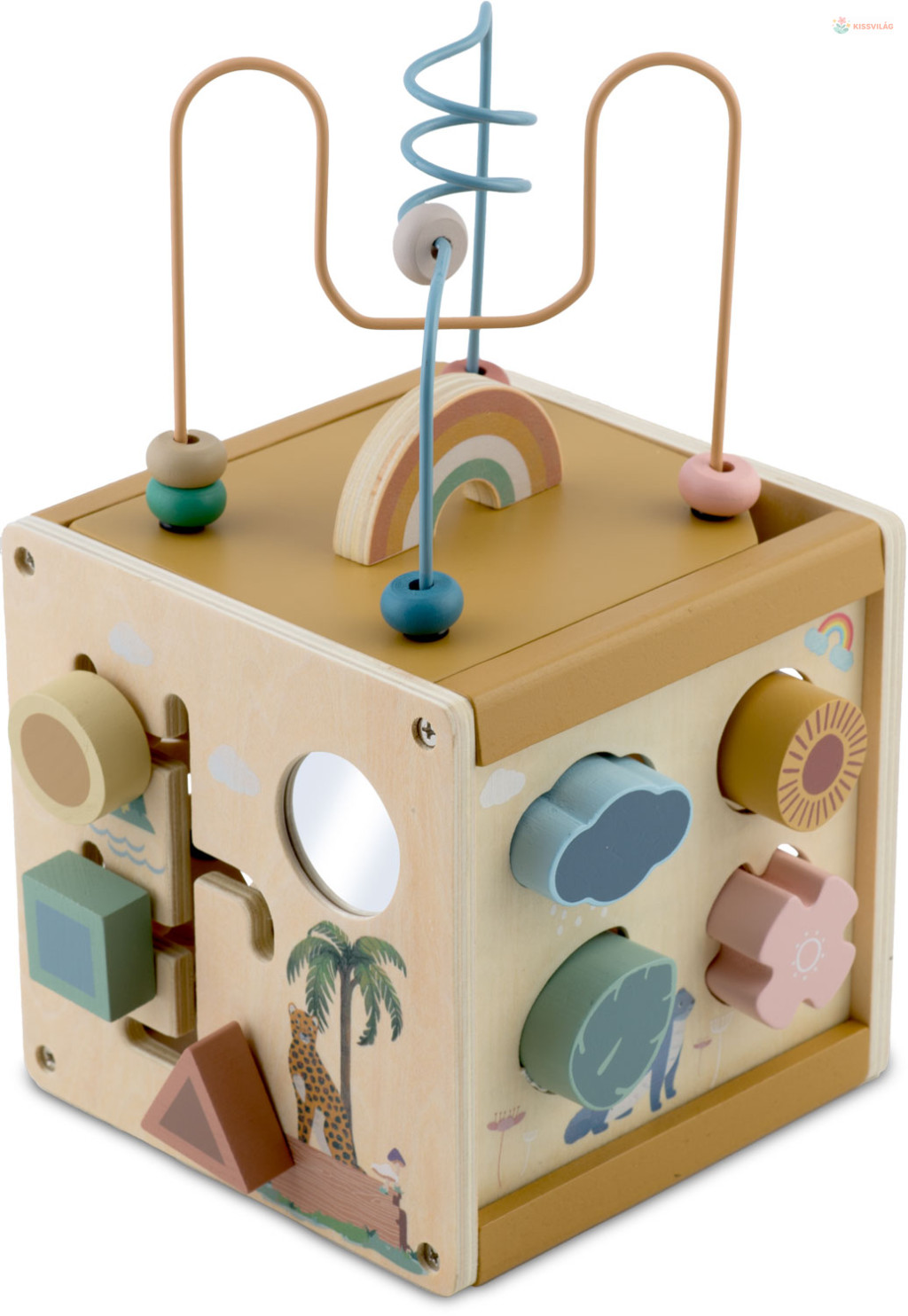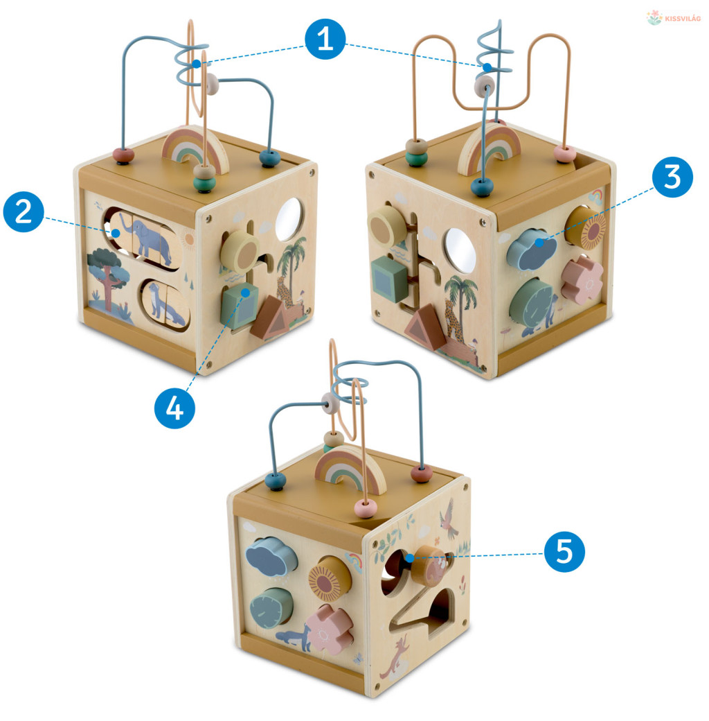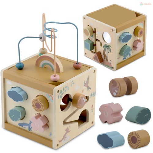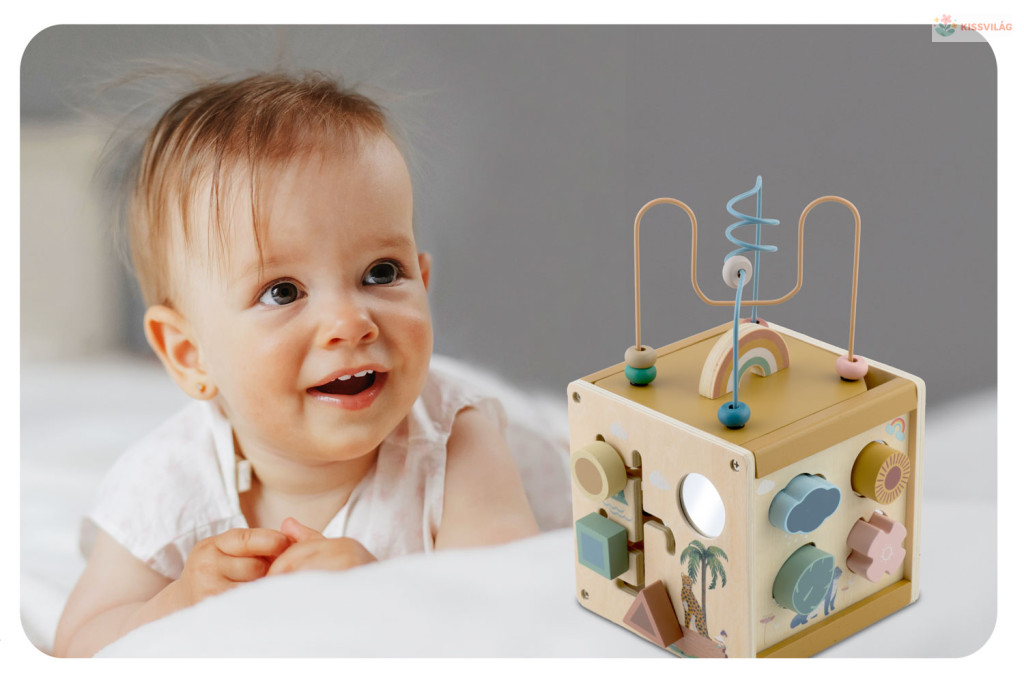 Fedezd fel a Nukido NK-861 fa szenzoros játékkockát, amely ötletes kialakításával és pasztell színeivel azonnal magára vonja a kicsik figyelmét. A kocka minden oldala más-más játékélményt kínál: golyópálya, formabedobó, forgatható állatos tárcsák és ujjvezető labirintus, így a gyermek játék közben tanulhat színeket, formákat és ok-okozati összefüggéseket. A gondosan csiszolt, natúr fa felület biztonságos, strapabíró, mégis kellemes tapintású, ezért hosszú távon is megbízható társ a mindennapi mókában. Miért jó a Nukido NK-861 fa szenzoros kocka? Részletgazdag, mégis letisztult grafikái nyugodt, barátságos környezetet teremtenek, miközben a gyöngyvezető és a csúszkák finom kézmozgásra ösztönzik a kicsiket. A többfunkciós kialakítás révén egyetlen játékkal számos fejlesztő tevékenységet biztosít, így kevesebb játék szóródik szét a szobában, mégis minden érzékszerv kap stimulust. A kocka teteje megfordítható és a golyópálya a belsejébe rejthető, ami helytakarékossá teszi otthon és utazás közben is. Ezért fogod szeretni: • 5 az 1-ben funkció: golyópálya, labirintus, formabedobó, forgótárcsa és csúszka • Pasztell, természetközeli színvilág: harmonikus, trendi gyerekszobákhoz • Masszív, természetes fa: tartós és környezetbarát választás • Rejtett tárolás: a felső pálya a kockába hajtható, így könnyű elpakolni • Ajándékbarát csomagolás: színes doboza miatt tökéletes meglepetésként is Használati útmutató: • Fordítsd a fedőt a gyöngyvezetővel felfelé és helyezd a kocka tetejére • Válaszd ki a korongot vagy formát, majd vezesd végig a pályán vagy illeszd a megfelelő nyílásba • Játék után emeld le a tetőt, fordítsd meg, és csúsztasd be a kocka belsejébe, hogy a kiálló elemek ne sérüljenek • Tartsd felügyelet alatt a gyermeket a kisebb darabok használatakor A csomag tartalma: • 1 db Nukido NK-861 fa szenzoros kocka • 1 db levehető gyöngyvezető tető • 6 db formabedobó elem pasztell színekben • 2 db forgatható állatos korong