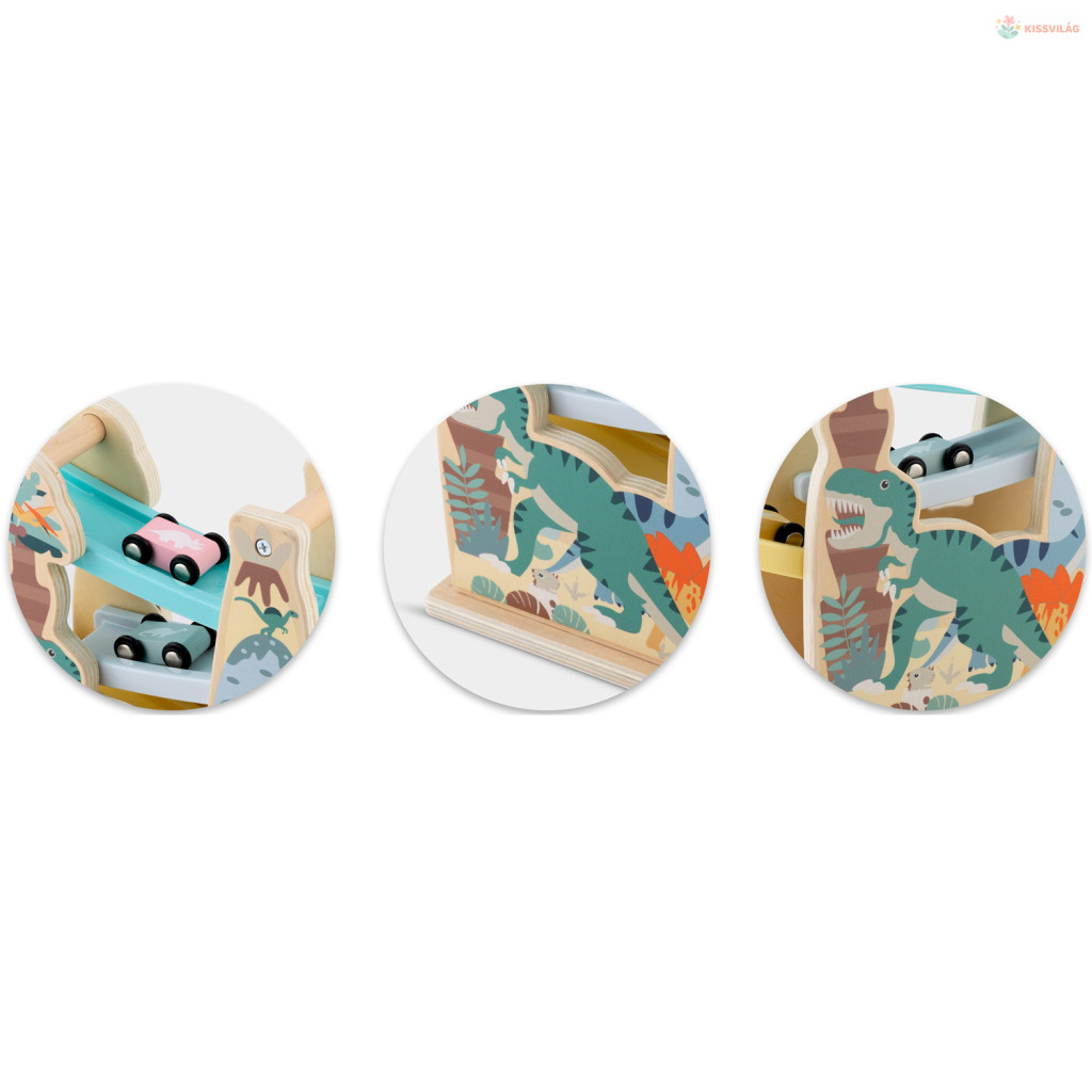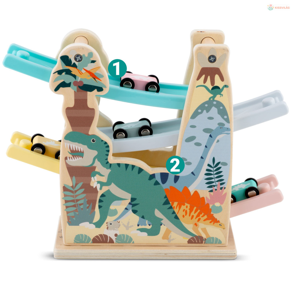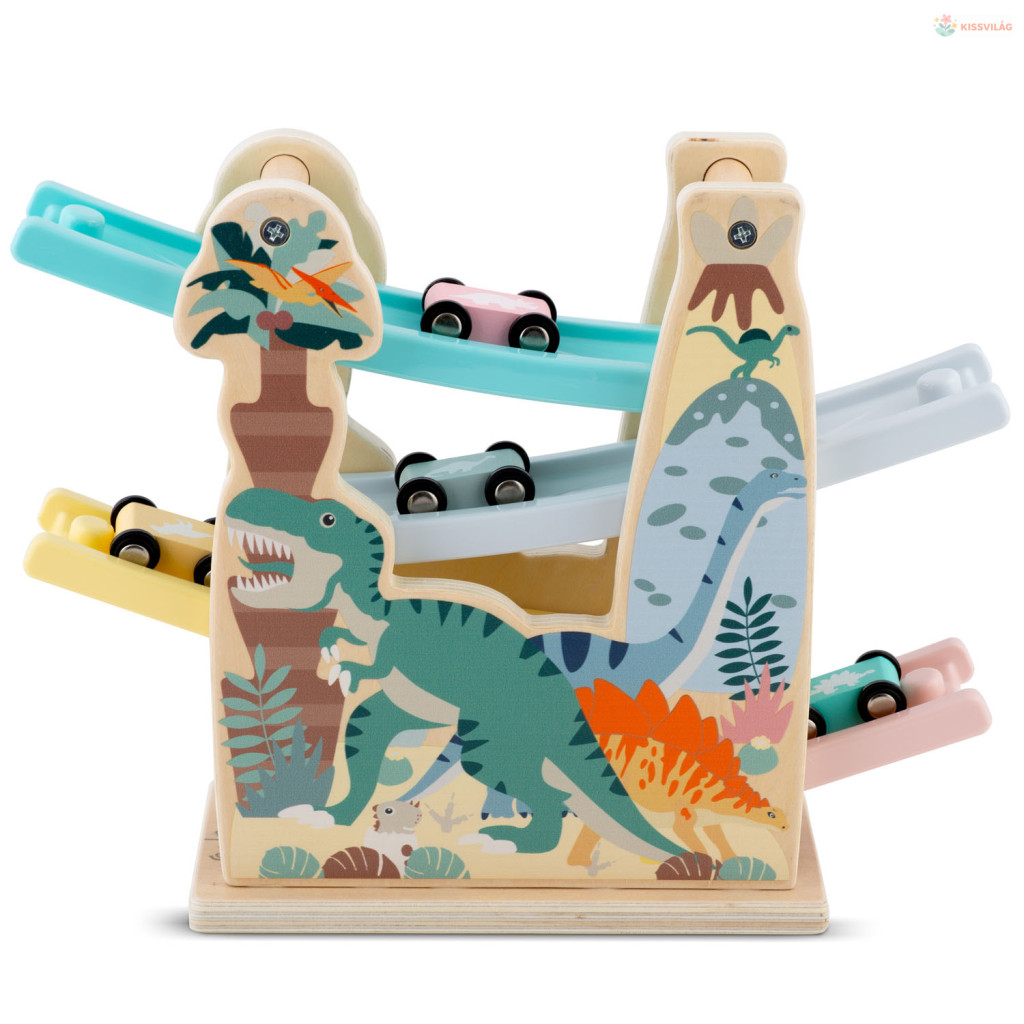 Fedezd fel a természetes fa varázsát a Ricokids RK-867 dinoszauruszos autópályával! A négyszintes, színes csúszda vidám dínó-mintáival és négy apró versenyautójával pillanatok alatt magára vonja a kicsik figyelmét. A kocsikat felülre helyezve a lejtőkön száguldanak végig, így a gyermek játék közben ismerkedik a gravitáció és a sebesség alapjaival. A gondosan csiszolt, EN-tanúsított fa biztonságot, a tartós festés hosszan tartó élénk színeket garantál. Miért jó a Ricokids RK-867 dinoszauruszos fa csúszda? Ez a kreatív fajáték nemcsak szórakoztat, hanem finomhangolja a szem-kéz koordinációt és támogatja a problémamegoldó gondolkodást. A négyszintes pálya látványos gurulást kínál, amely hosszú percekre leköti a kicsik figyelmét. Masszív felépítése ellenáll a mindennapos igénybevételnek, így bátran átadható testvéreknek, sőt akár generációról generációra is továbbörökíthető. Ezért fogod szeretni: • 4 szintes lejtő, folyamatos gurulás élményével • 4 különböző színű mini autó, azonnali versenyekhez • Biztonságos, EN-minősített natúr fa és gyermekbarát festék • Dínó-grafikák és élénk színek a vizuális élményért • Ideális ajándék, csomagolással együtt azonnal átadható Használati útmutató: • Helyezd a csúszdát stabil, sík felületre • Tedd az egyik autót a legfelső sínre, majd engedd el • Figyeld, ahogy a négy lejtőn végiggurul, míg az alsó rámpán megáll • Ismételd a többi autóval, vagy rendezz gyorsasági versenyt • Játék után gyűjtsd össze az autókat, és tárold a pályát száraz helyen A csomag tartalma: • 1 db négyszintes fa dinoszauruszos csúszda • 4 db színes mini versenyautó