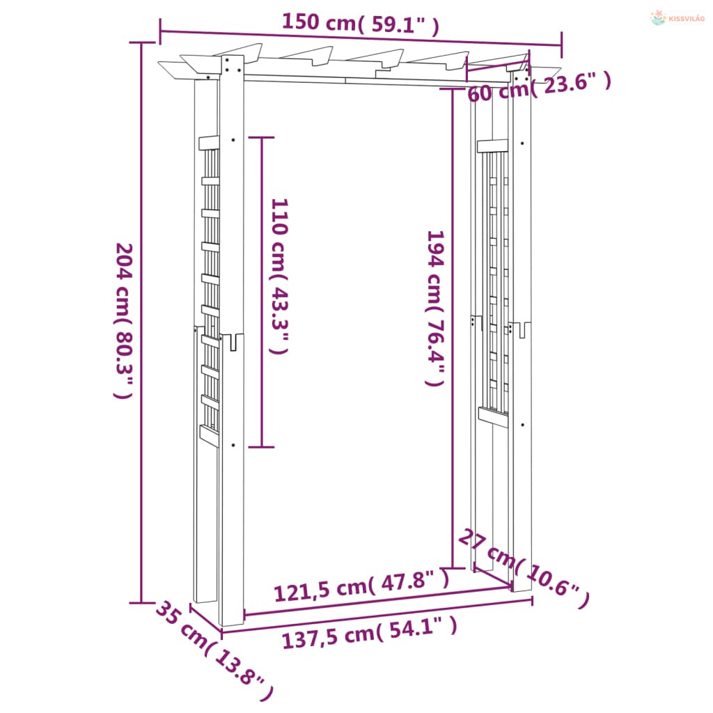 Ez a kiváló minőségű fából készült lugas / rózsakapu kertje középpontja lesz, egyszersmind nagyszerű választás is futónövényei és rózsái számára. Stabil alapot nyújt a rózsáknak és más futónövényeknek, amelyek nyárára csodás környezetet fognak teremteni. Emellett, egy pompás bejárat kialakítására is alkalmas.
