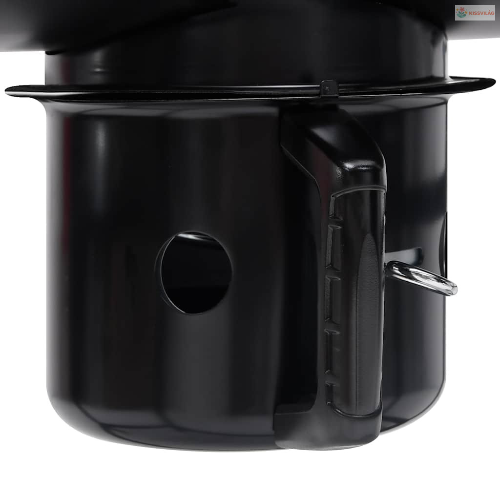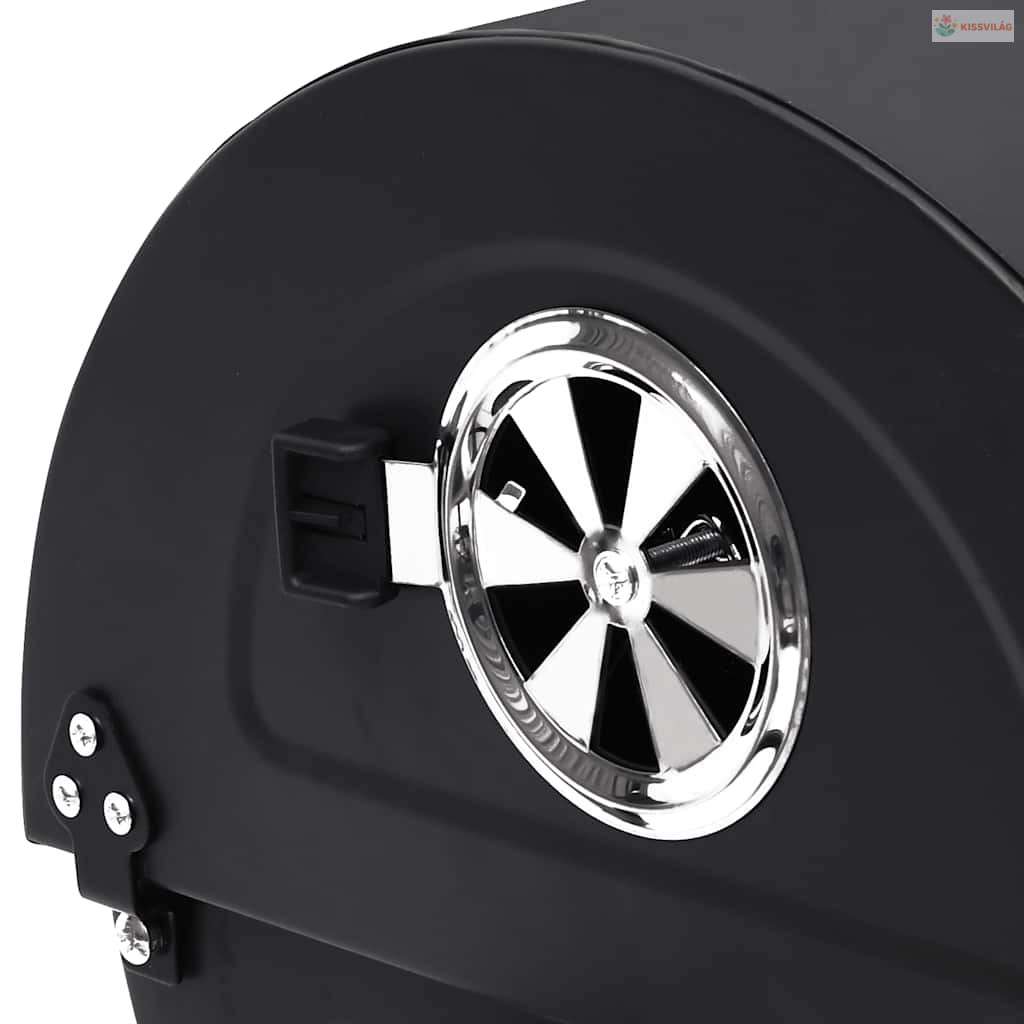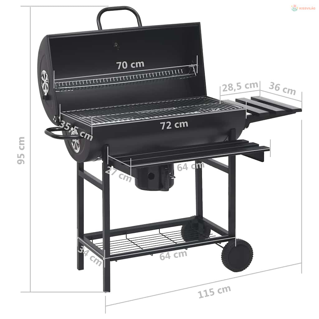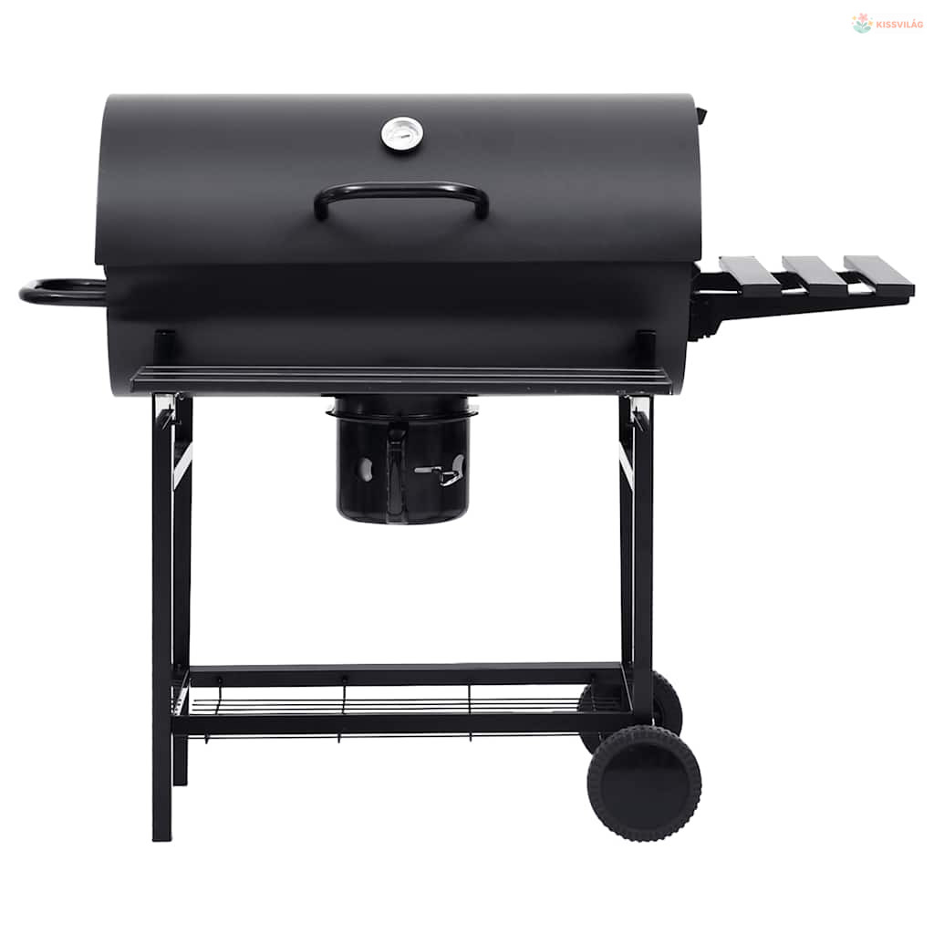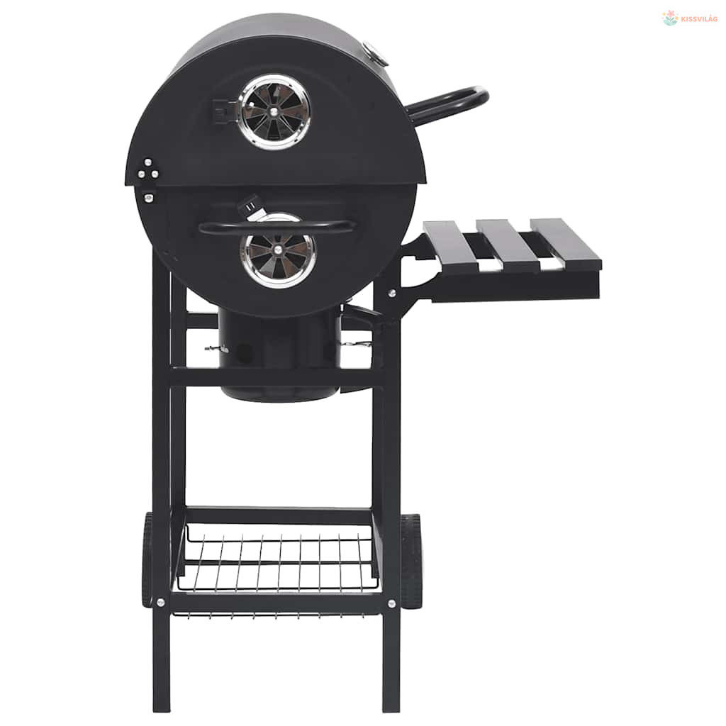 Fekete acél hengeres grillsütő kerékkel és polccal 115x85x95 cm