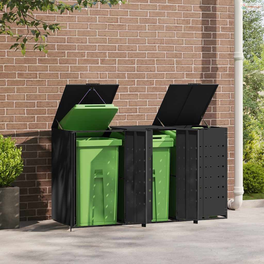 Fekete acél kerekes tároló 3 szemeteskukához 207 x 79 x 117 cm