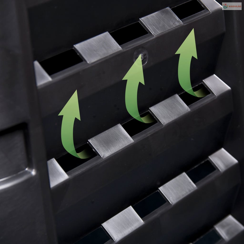 A nagy hőfejlődés a komposztáló egységben elősegíti a baktériumok gyorsabb lebontását, és jobb humuszt eredményez. Kompakt kialakítása révén a kerti komposztáló kevés helyet foglal el, mégis nagy mennyiség feldolgozására képes. A tetején lévő fedél megkönnyíti a felülről történő betöltést, a fül pedig a humusz egyszerű kivételét biztosítja. A csepegtető öntözőrendszer, a lakatfurat, a szilárd oldalsó reteszek, az erős zsanérok, a kényelmes fogantyú és a kényelmes tartókkal ellátott nagy csúszókapu mind hozzájárulnak a felhasználóbarát használathoz.