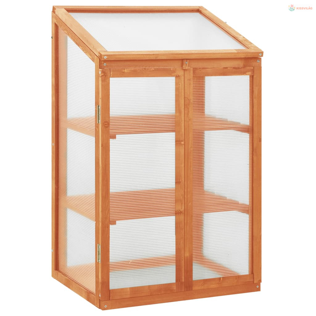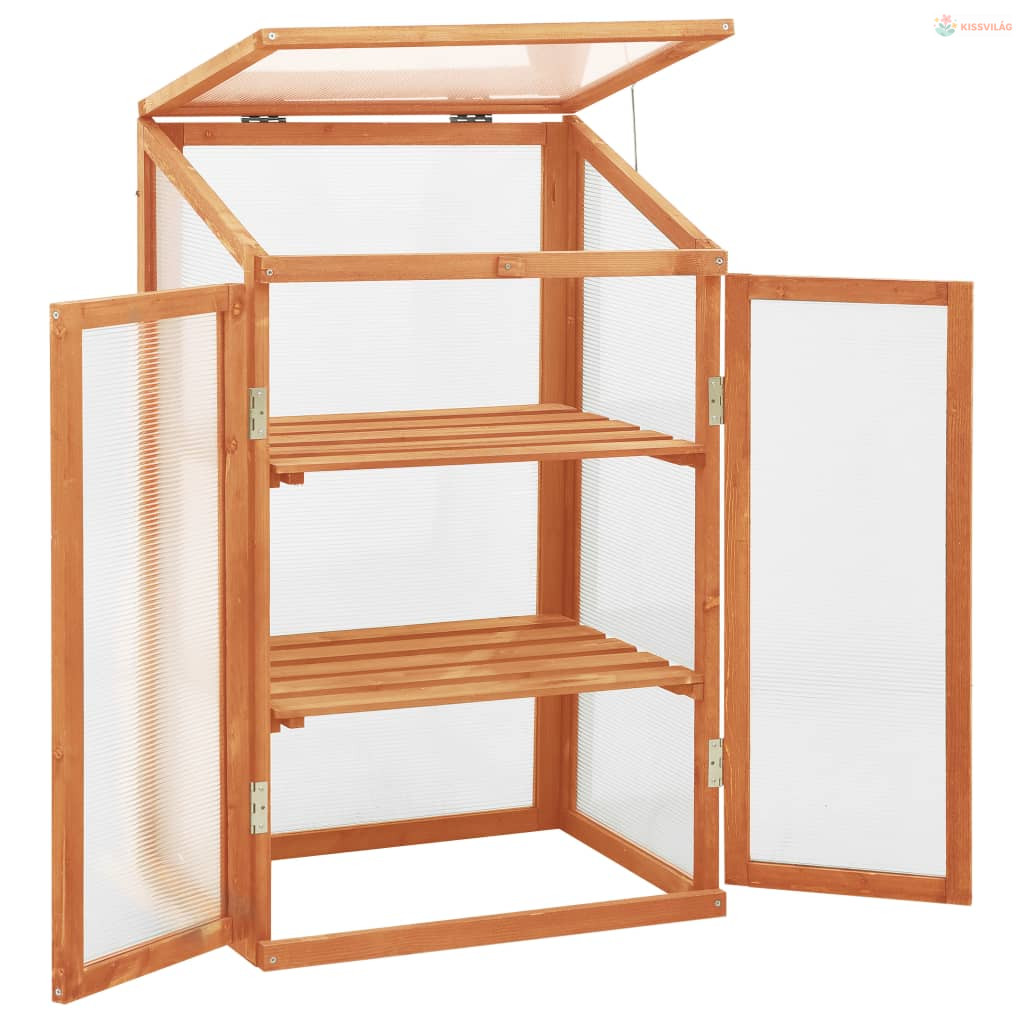 Ez a fa kerti melegház PC-lemezekből és tömör fenyőfából készült, így stabil és strapabíró. 2 polccal lett ellátva, mely bőséges helyet kínál növényei, virágai vagy gyógynövényei számára. A zsanéros tetőnek köszönhetően a növényeket könnyű locsolni vagy eltávolítani.