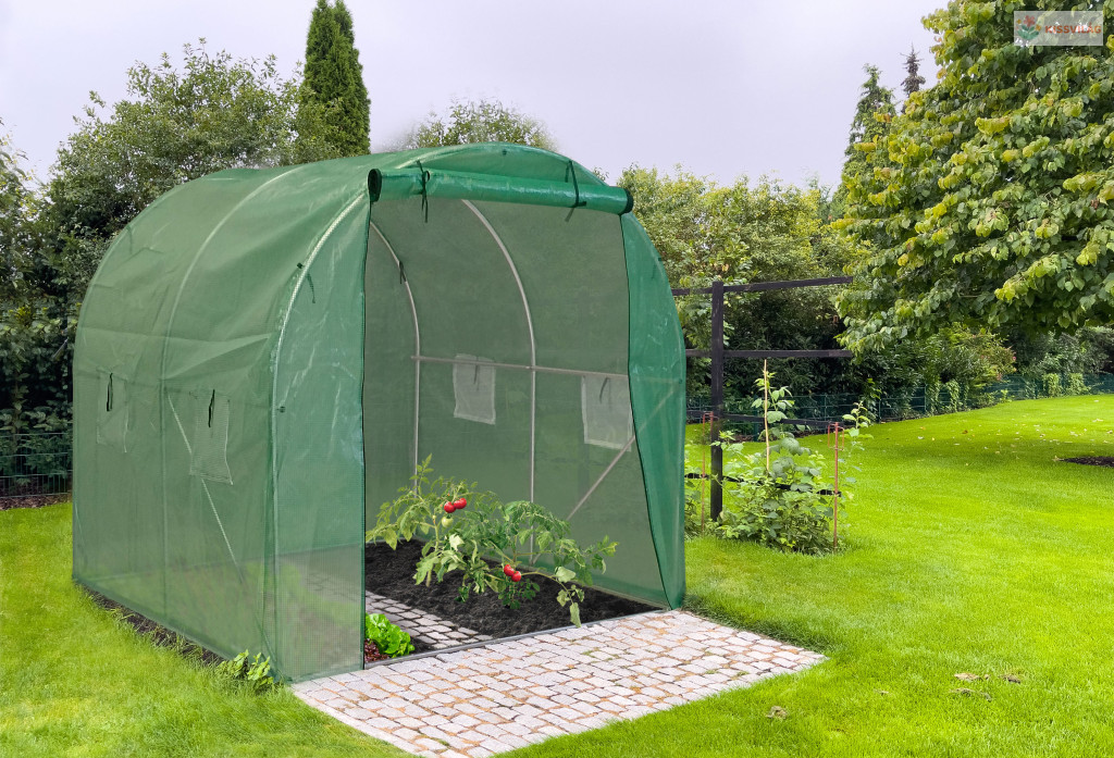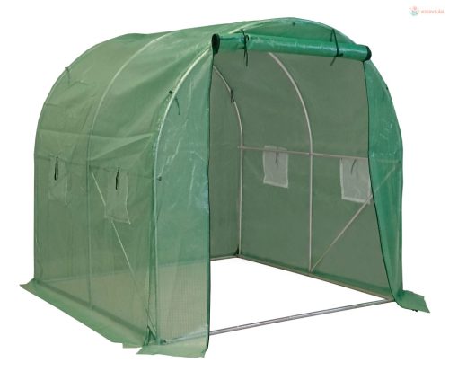 Kerti fóliasátor stabil horganyzott acélszerkezettel, minőségi erősített polietilén (PE) fóliával, elülső fal 120 cm széles bejárati nyílással, 4 szellőzőablakkal, 4 rögzítő kötéllel és csapokkal, cipzáras felgöngyölíthető bejárattal.