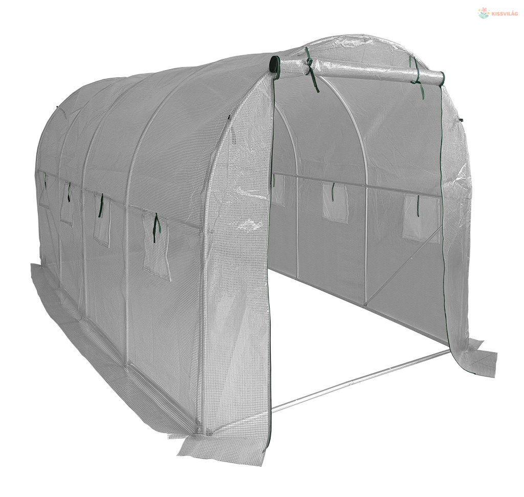 Kerti fóliasátor stabil horganyzott acélszerkezettel, minőségi erősített polietilén (PE) fóliával, elülső fal 120 cm széles bejárati nyílással, 8 szellőzőablakkal, 4 rögzítő kötéllel és csapokkal, cipzáras felgöngyölíthető bejárattal.