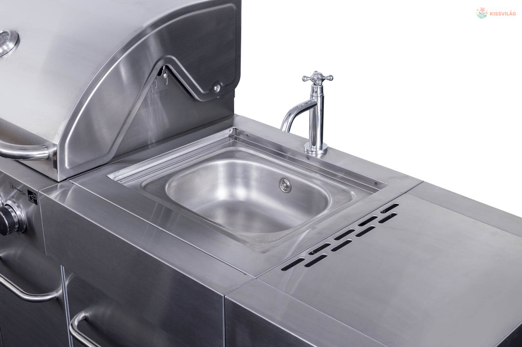 Mi nem hiányozhat egy konyhából sem? A mosogató. És az nem hiányzik a G21 BBQ Arizona Premium Line grillnél sem. A beépített mosogató egy vízcsővel vanellátva, mely a kerti tömlőre csatlakoztatható. Az edények elöblítéseután a mosogatót egy fa vágódeszkával takarhatja le, így nagyobbmunkafelületet kap a finomságok elkészítésére a nyári grillezéshez.