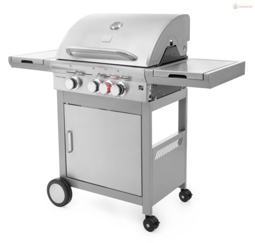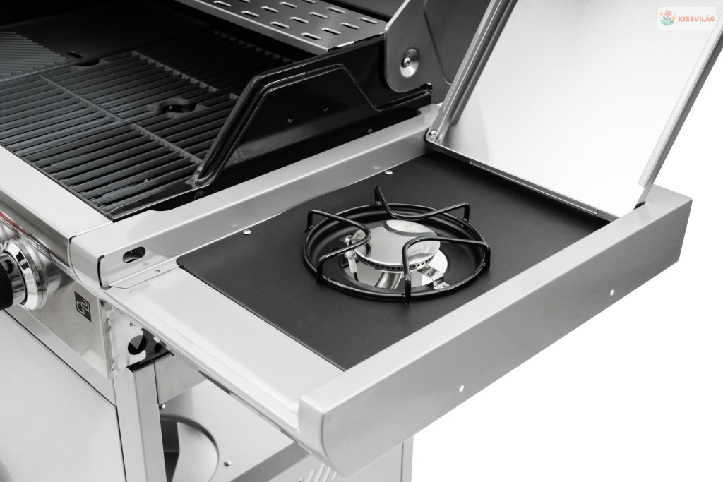 A kerti gázgrill egy csuklós fedéllel rendelkezik, mely lefedi az összes égőt,továbbá mindkét oldalán polcok találhatók.A bal polc alatt egy tárolóedény van, amelybe előkészítheti például a grillezni kívánt bepácolt húst.A jobb oldali polc alatt egy oldalsó égő található. A grill kiváló minőségű rozsdamentes acélból készül.