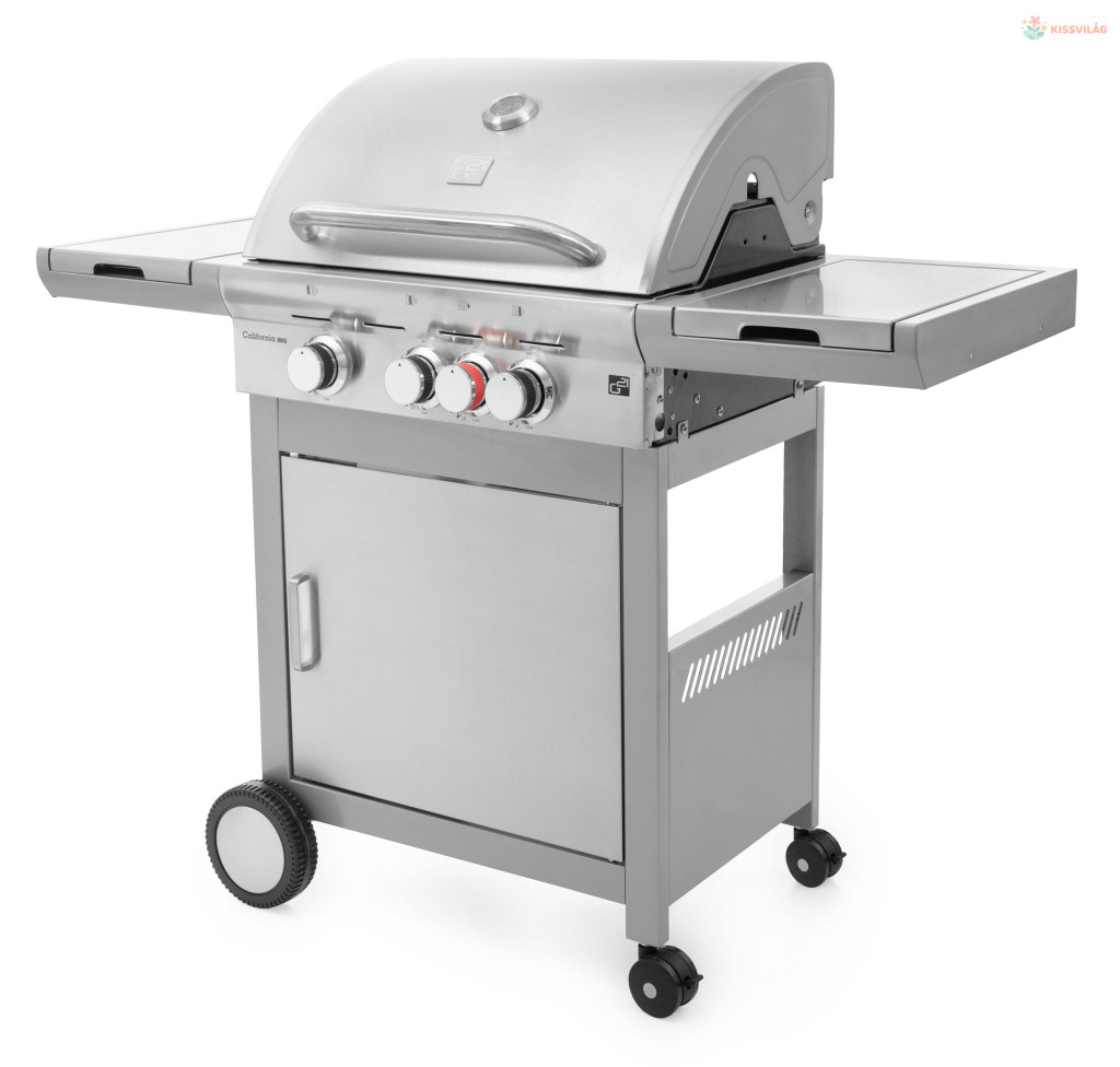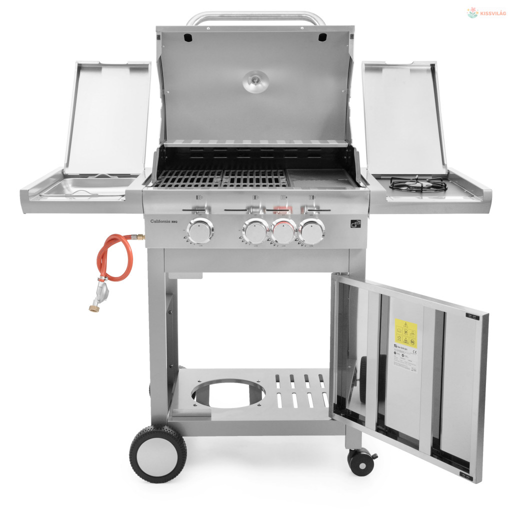 G21 Californiia BBQ rozsdamentes acél gázgrill öntöttvas ráccsal, öntöttvas lemezzel, elektromos gyújtással, gázszabályozással, 3,15 kW teljesítményű oldalsó égőfejjel és 3 fő égővel 3,5 kW maximális teljesítménnyel, Flame Tamer rendszer.