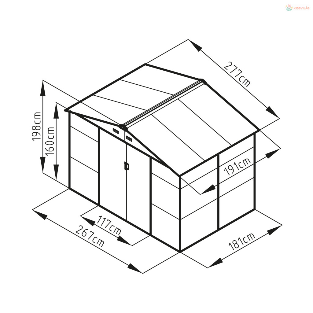 A tároló elülső szélessége 277 cm, magassága a legmagasabb pontnál 198 cm, az oldalának szélessége 191 cm. A tető nélküli fal magassága 163cm. Az elülső oldalon található az ajtó.