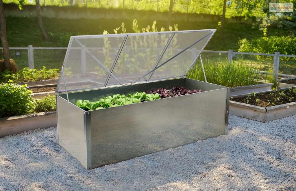 A felső alumíniumkeret  4 mm-es polikarbonát töltelékkel kényelmeshozzáférést biztosít az ültetéshez és a már elültetett növényekgondozásához.