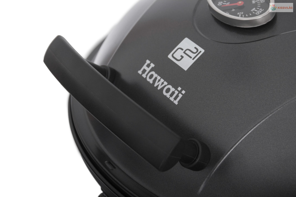 A G21 Hawaii elektromos grill, összecsukható asztallal és 2,4 kW teljesítménnyel, termosztáttal rendelkezik, 100 °C - 220 °C-ig állítható hőmérséklet tartománnyal. A hordozható girll nagy grillező felülettel és fedéllel, ötletesen kialakítotttároló hellyel és kerekekkel rendelkezik. Grillezés után a grill állványát könnyen összecsukhatja és az egész grillt kényelmesen és fáradozás nélkül áthelyezheti.