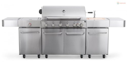 G21 Nevada BBQ rozsdamentes acél gázgrill csirkére, steakre vagy gyrosra, grillnyárs motorral. Öntöttvas rostéllyal, hőmérővel és oldalsó égőfejjel, összesen 8 égőfej (8 x 4 kW), Flame Tamer rendszer. Beépített mosogató, vágódeszka, gázszabályozás.