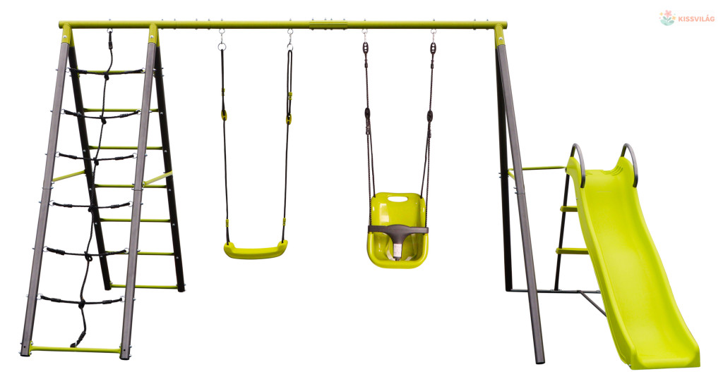 Nagy és teljesen felszerelt kerti gyermek attrakció - keret, 1 hinta, 1 kisgyermek hinta és csúszda. Tartós és stabil fémszerkezet létrával és mászóhálóval, sokoldalúan használható.