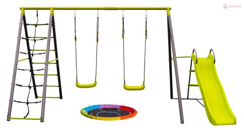 Nagy és teljesen felszerelt kerti attrakció gyermekek számára - egy keret, 2 hinta, egy hintaágy és egy csúszda. Tartós és stabil fémszerkezet létrával és mászóhálóval, sokoldalúan használható.