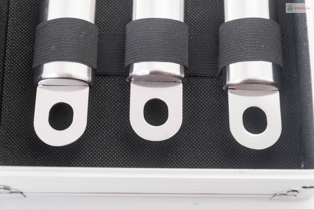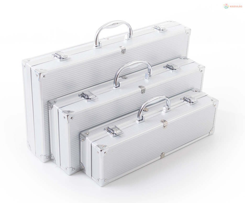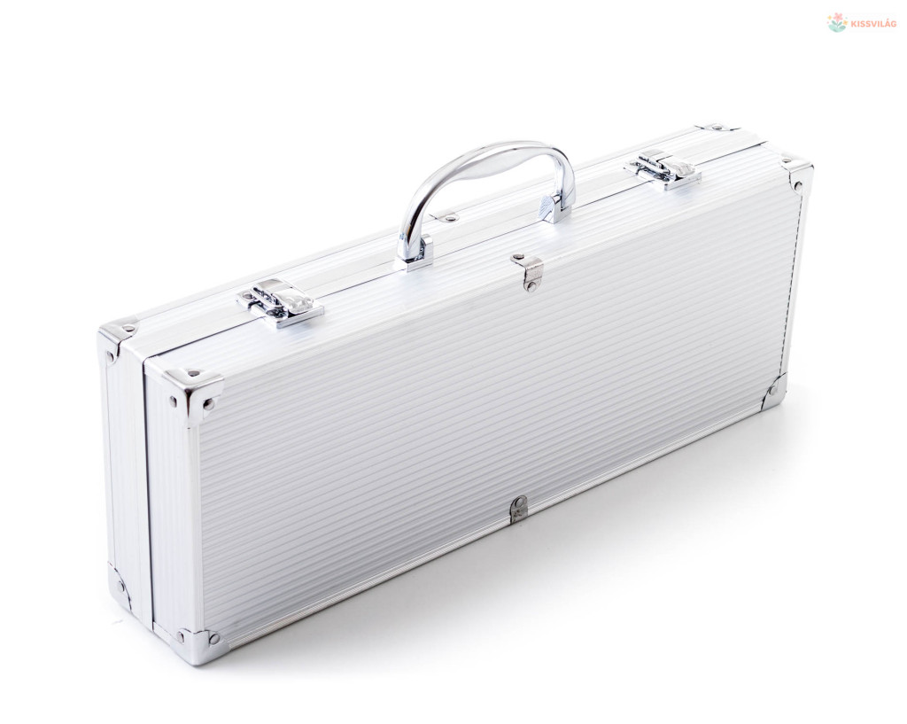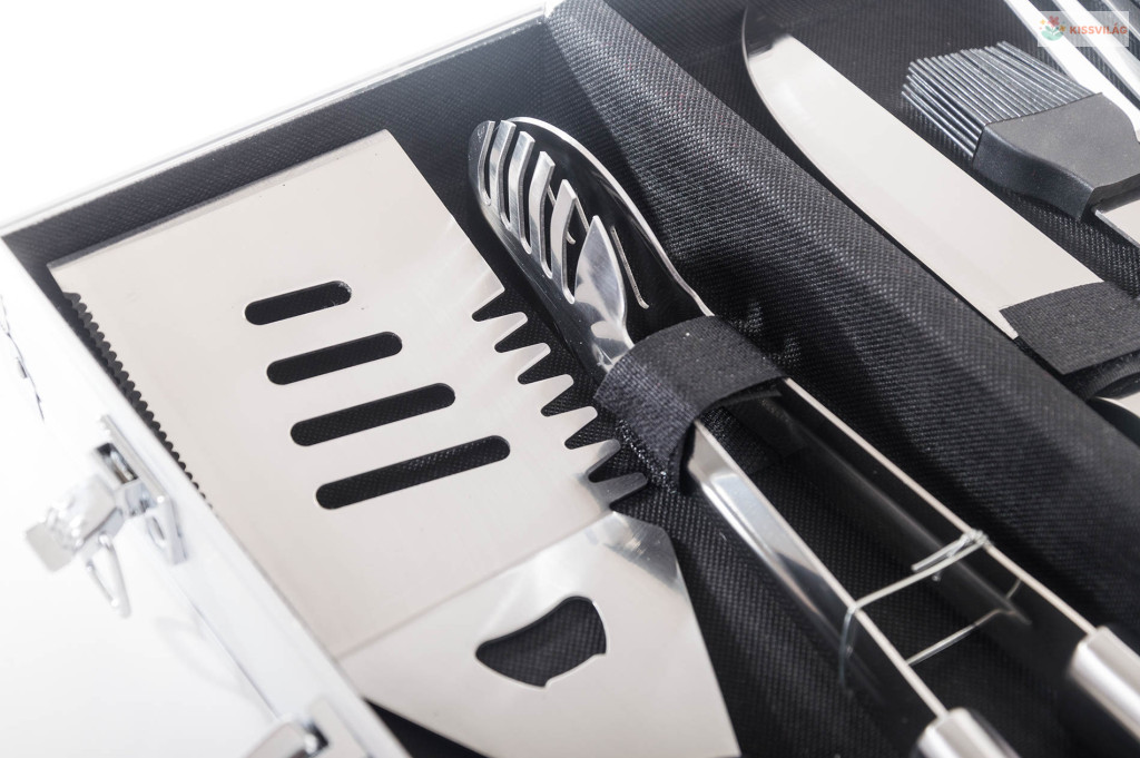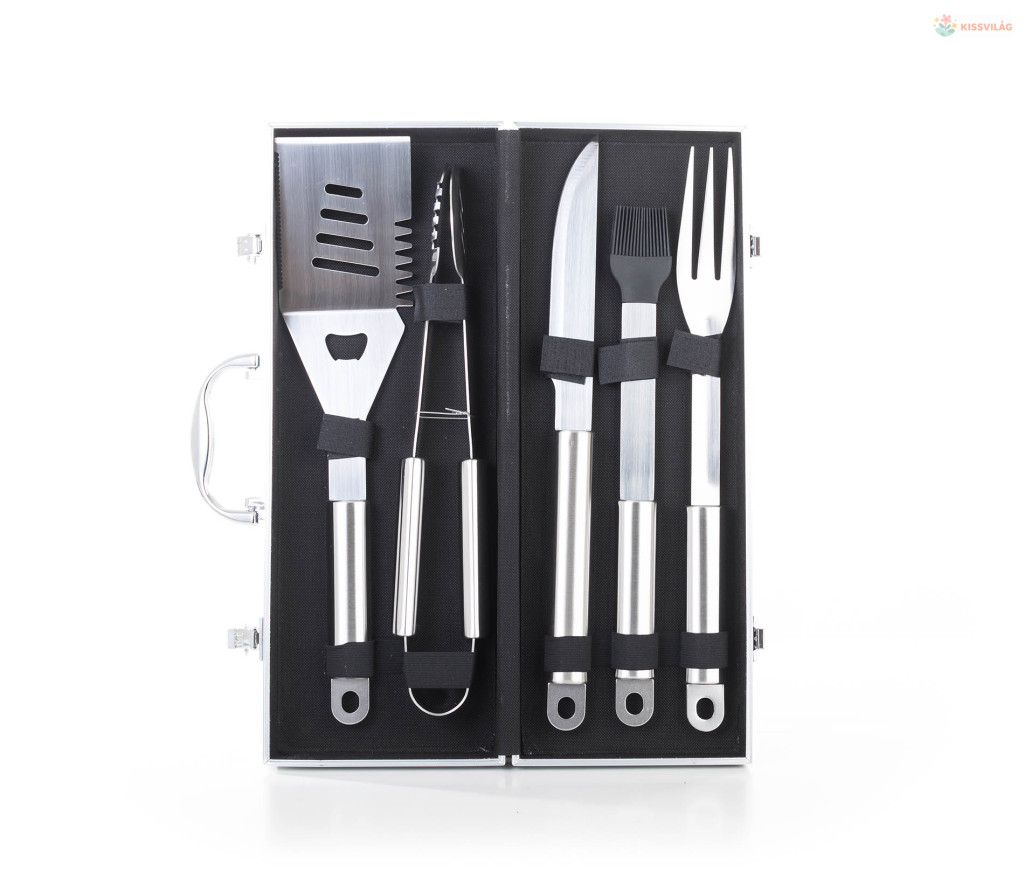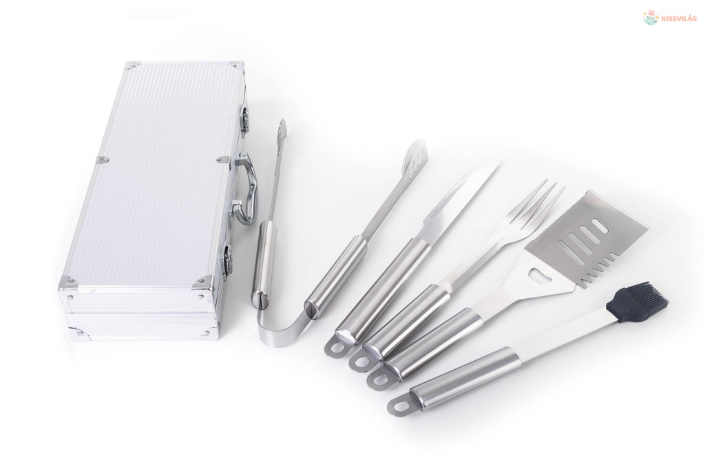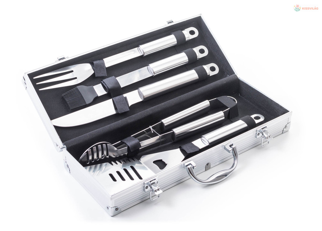 A készlet tartalmaz minden eszközt a gond nélküli grillezéshez. A készlet része egy húsforgató, villa, csipesz, hosszú grillező kés és kenőecset. Az eszközök 40 cm-es hossza biztosítja, hogy grillezés közben a lángok nem égetik Önt meg és nem fog Önre fröcsögni az olaj. Az egyszerű áthelyezés és tárolás érdekében az eszközök egy praktikus alumínium bőröndbe van elhelyezve.